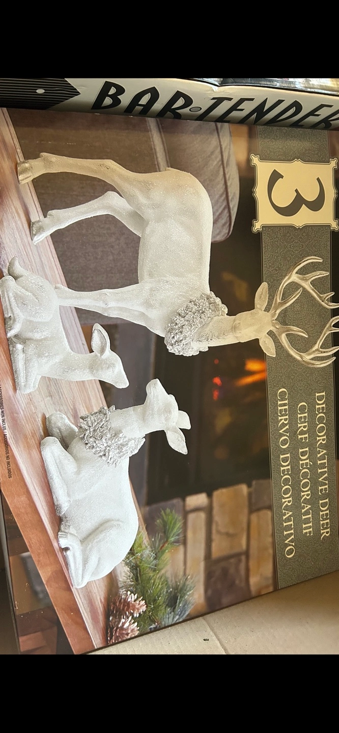 Set of 3 vintage silvery-white deer figurines. Includes one large deer with antlers, one smaller deer with antlers, and one fawn.