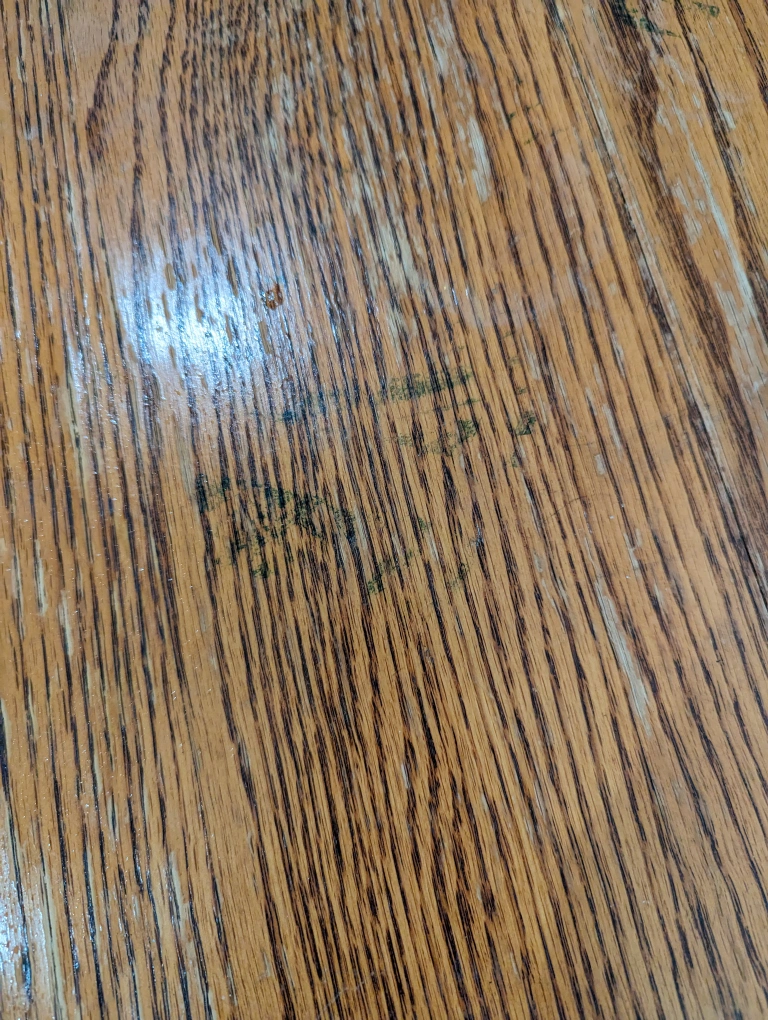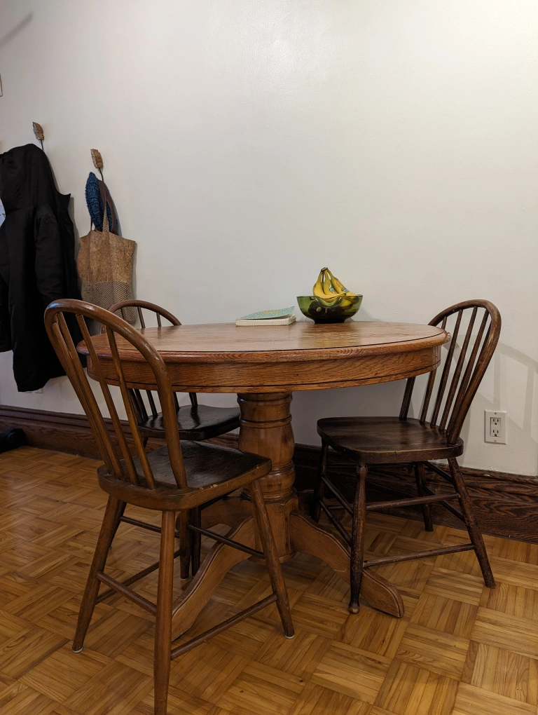 MOVING SALE!!! This round little table is perfect for small spaces and has seen me through a lot! The table and chairs are in great shape overall, though the surface of the table top is a little worn. (Top comes off for easy transportation.) Pet and smoke free home, must pick up.