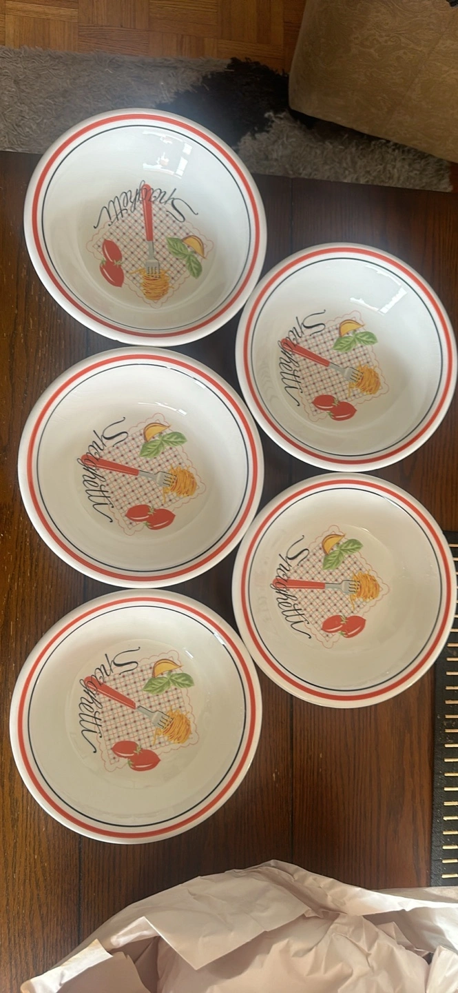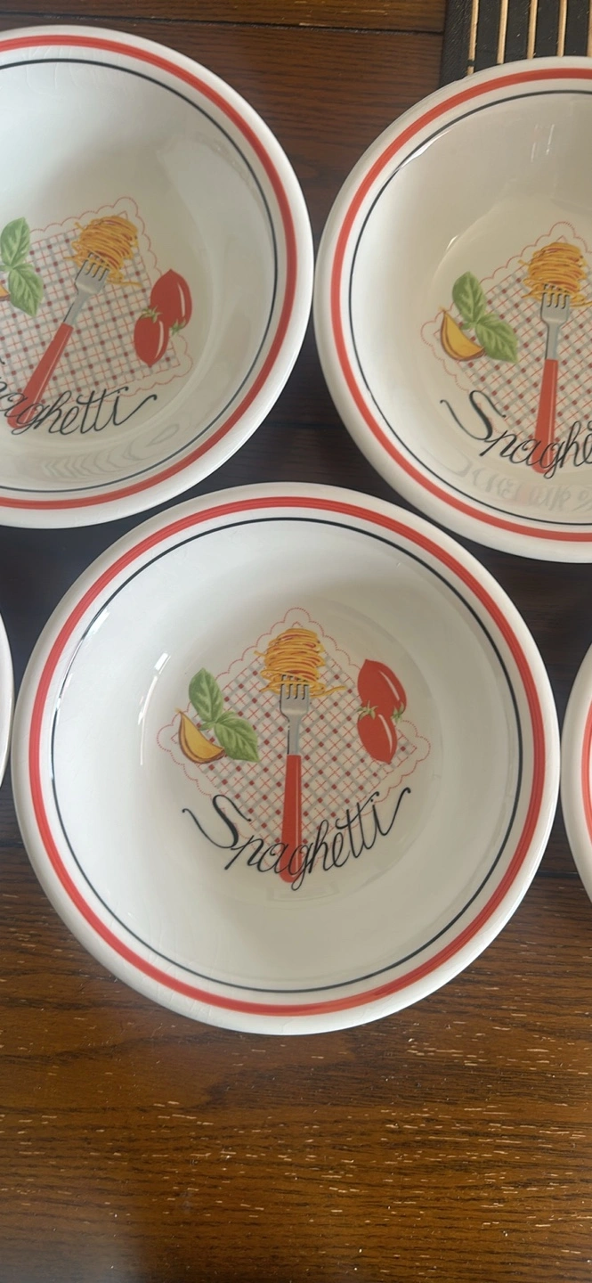 Set of five white bowls with red and black trim. Featuring spaghetti and tomato design. Good used condition