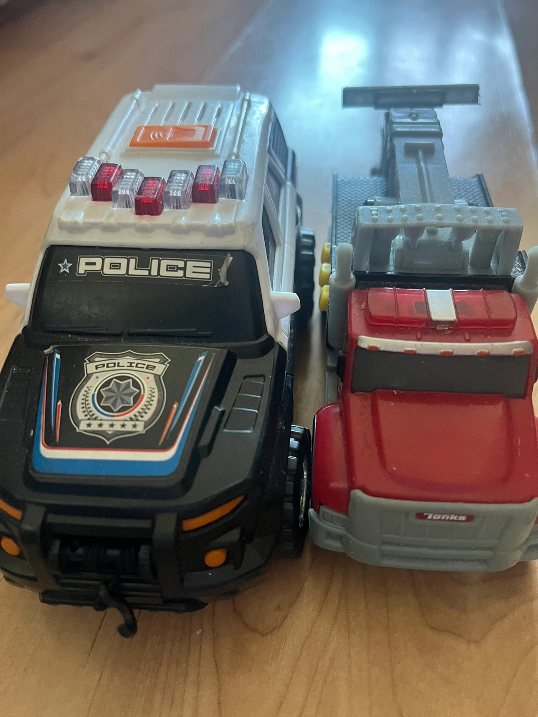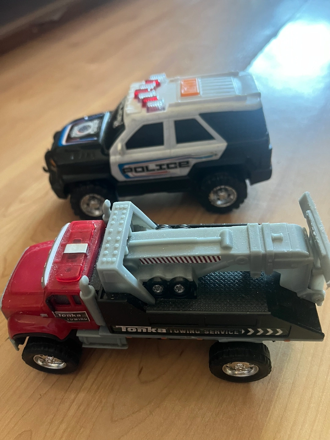Two Tonka toy vehicles. A black police car with a white roof and red lights. A red tow truck with a grey crane and a black bed. In a very good condition Pet free, smoke free home