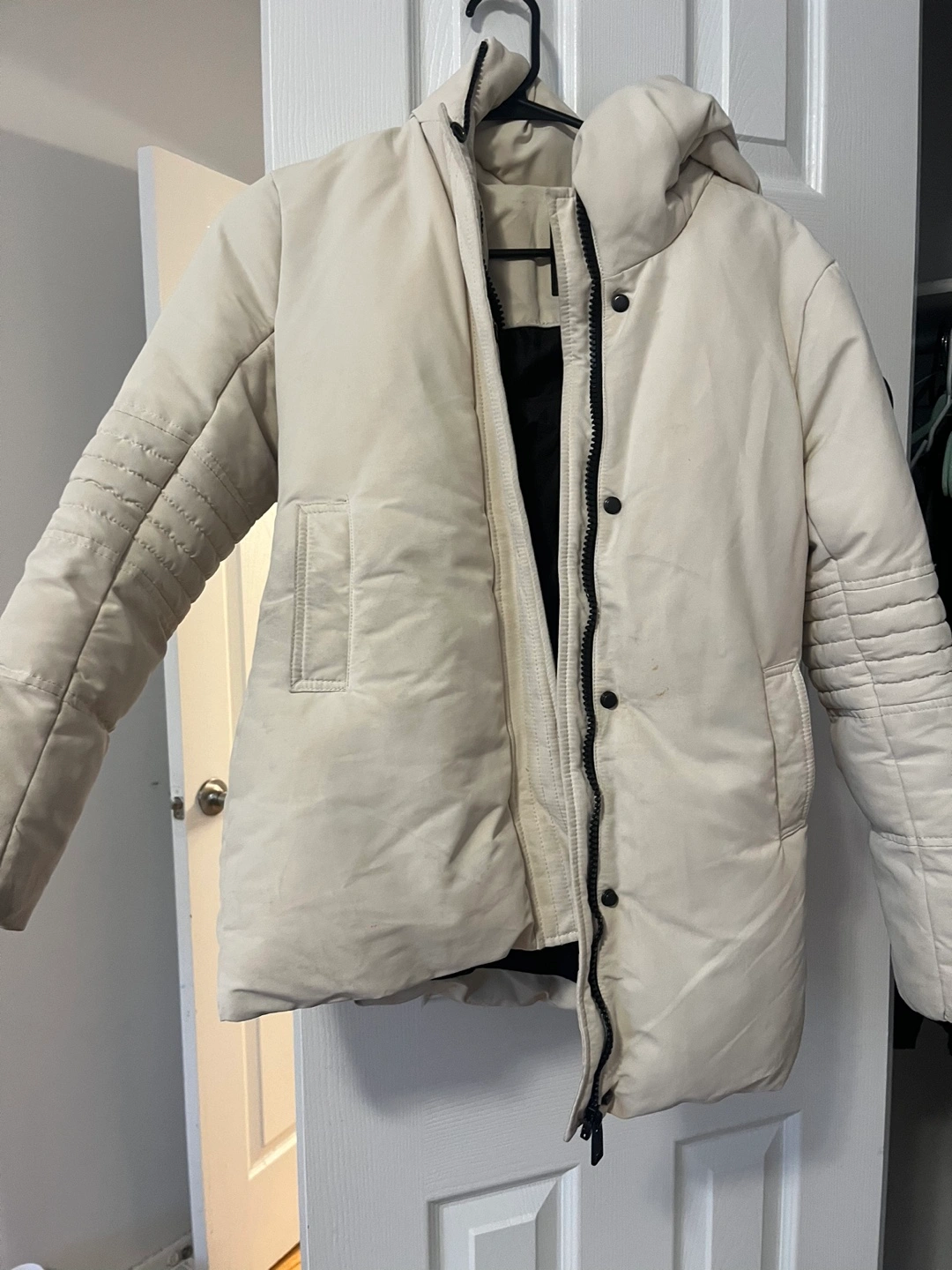 White puffer jacket with black accents. Has a hood and buttons +zipper