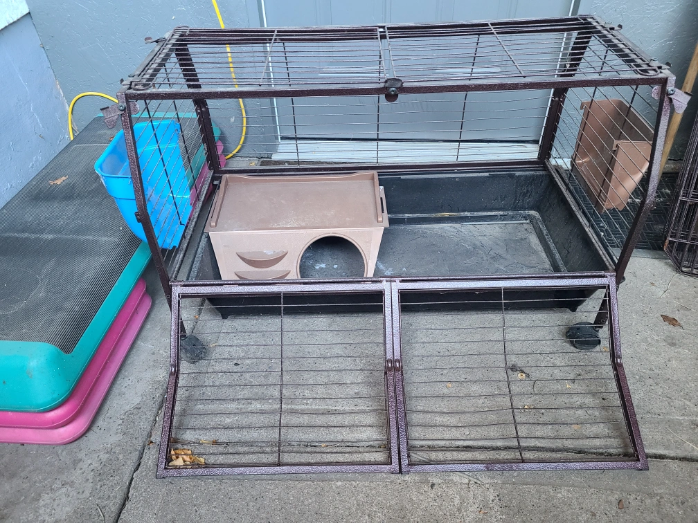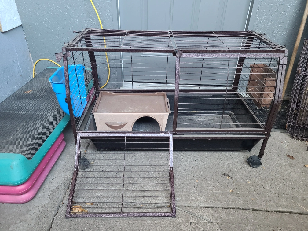Large brown metal cage with a pull out tray and wheels. Includes a plastic food dish, water bottle holder, and hideaway house. Top of cage also opens up for easy access. Bottom of cage slides out for easy cleaning. I will give it a good cleaning prior to selling.