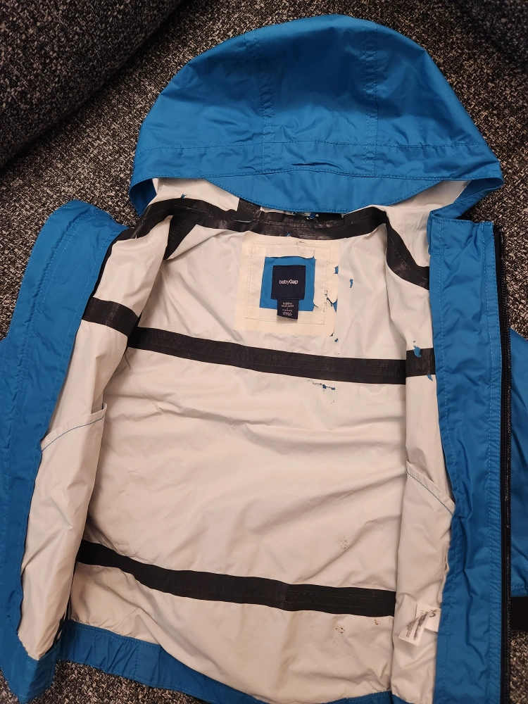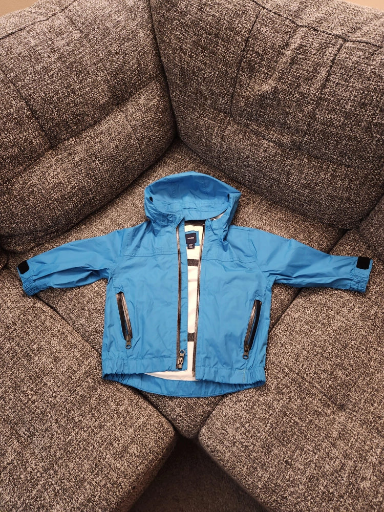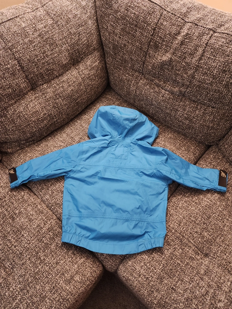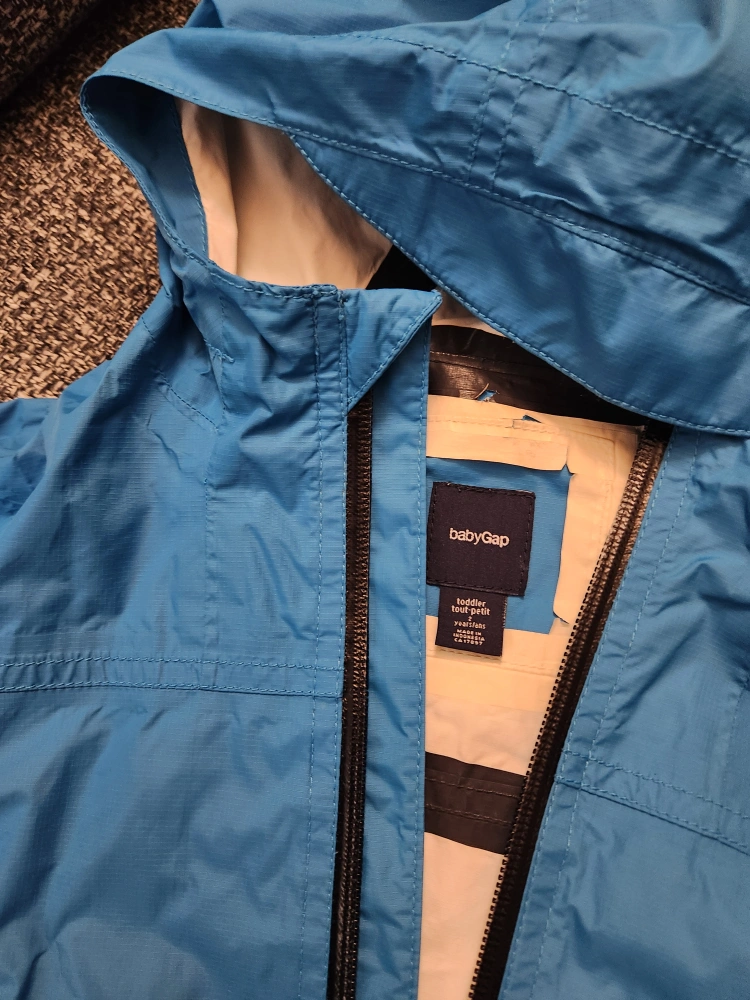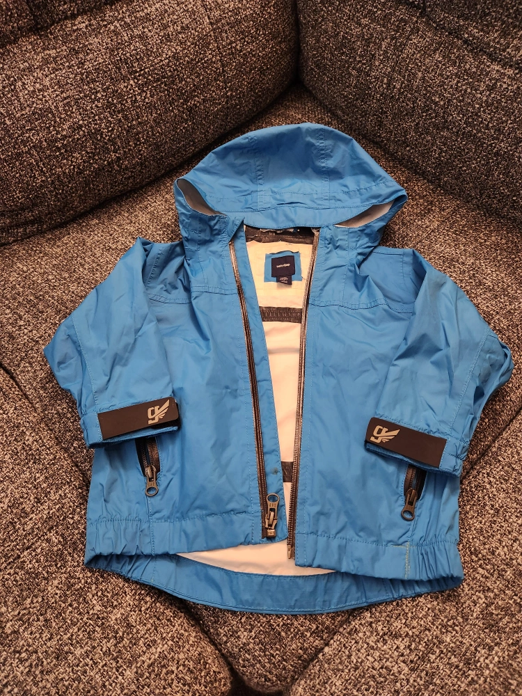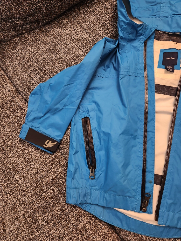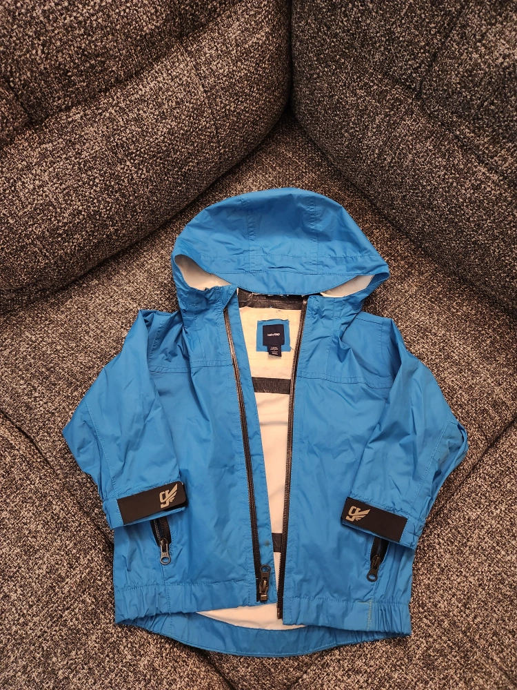 66Baby Gap Jacket, sz 2/2T (kids/toddler), windbreaker with hood and zipper closure -Colour = blue, weather protection-rain & wind -FYI-There is wear on the inside liner, photo shown. No wear on outside and it does not affect quality or function of outer material, does not show wear or tear outside. Two Zippered pockets and elastic cuffs -Pick up @ Bathurst & Steeles, North York. *Only $5!