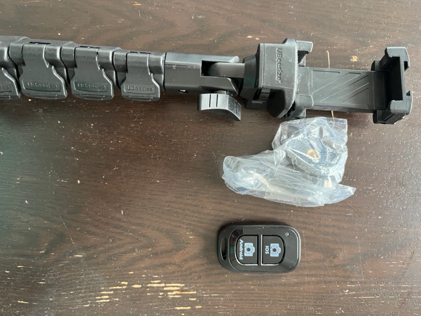 To summarize: 1 trip pod/selfie stick holder, 1 wireless shutter remote, 1 universal head phone holder, 1 go pro attachment.