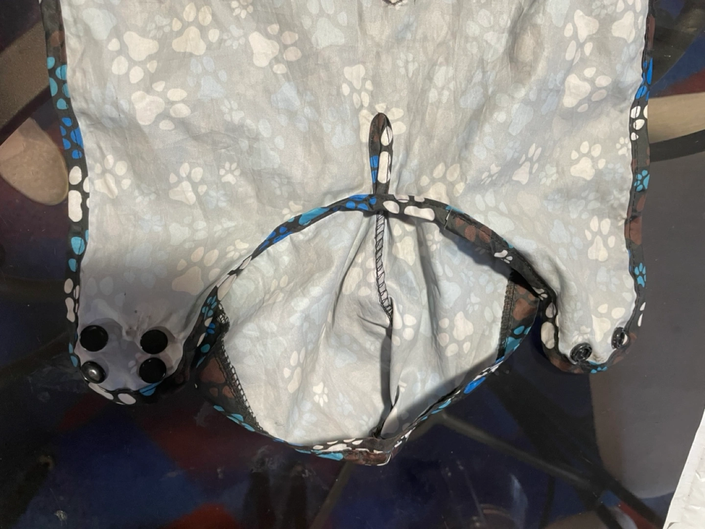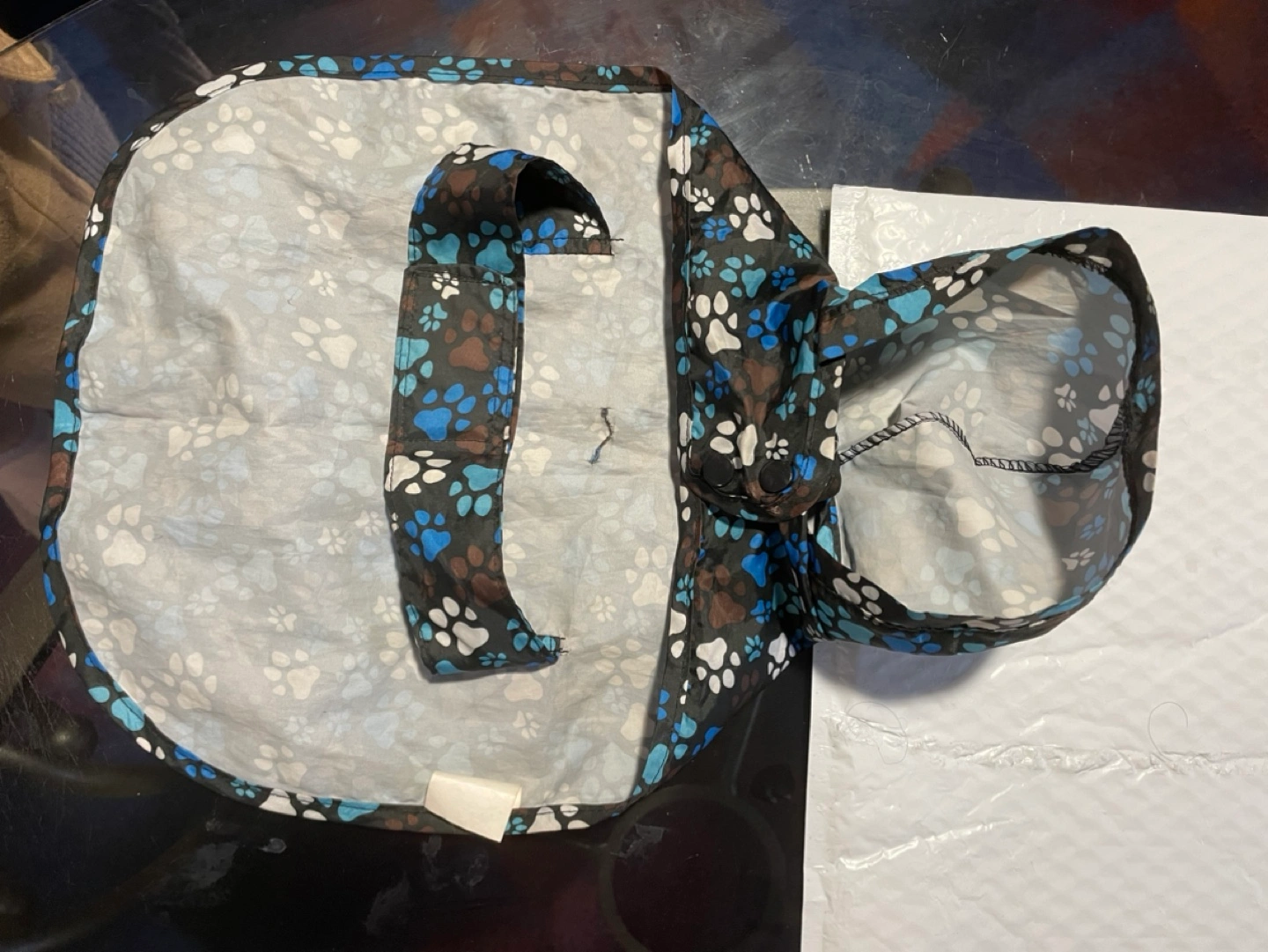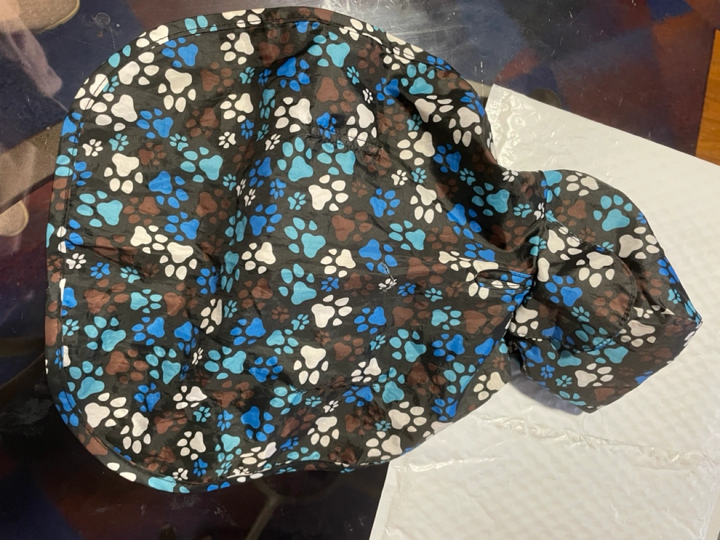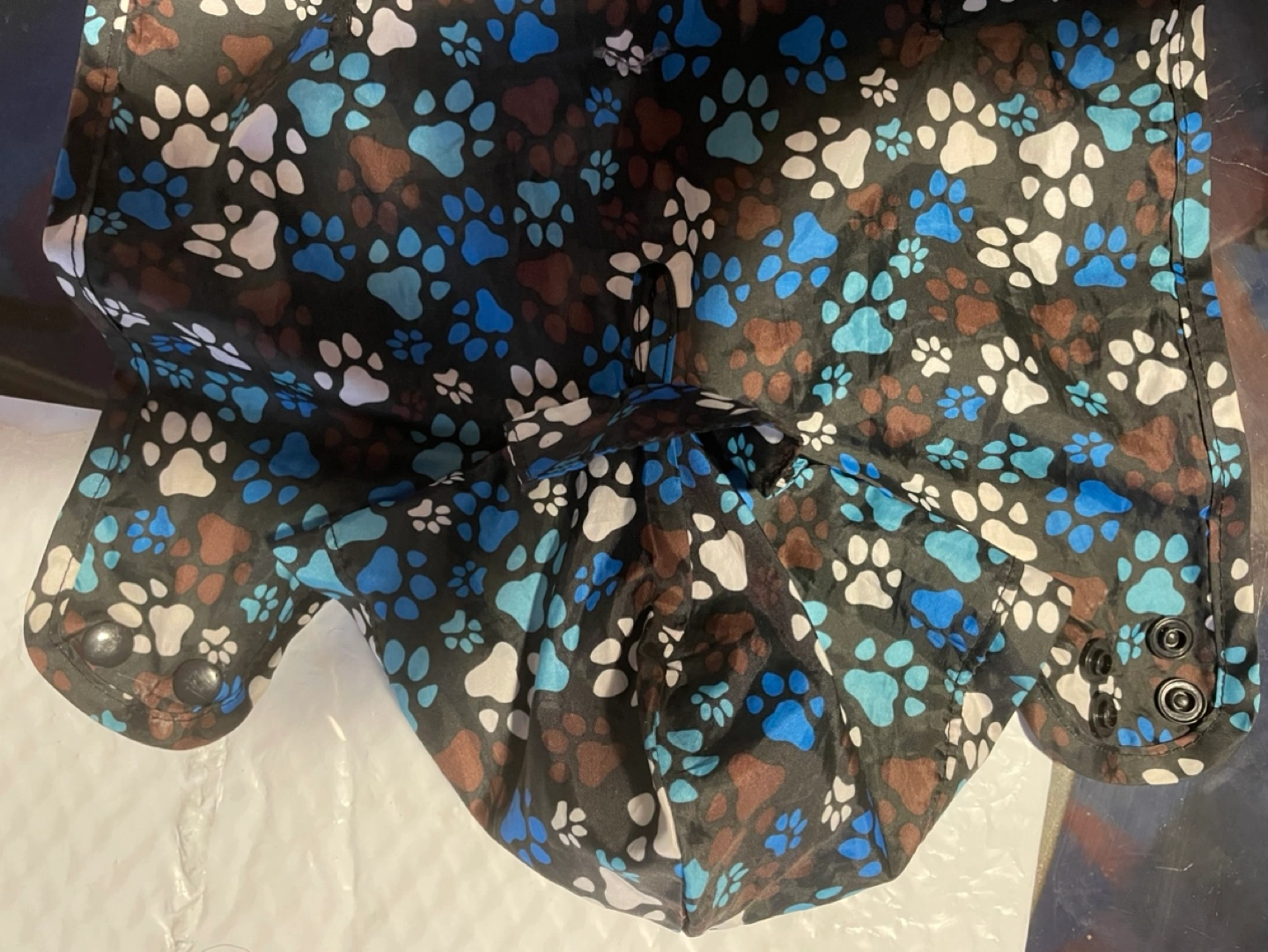 Waterproof small raincoat for dogs. Features a hood and paw print design. A button closure around the neck keeps hood on the mid strap wraps around the lower chest area. Hood is detachable.