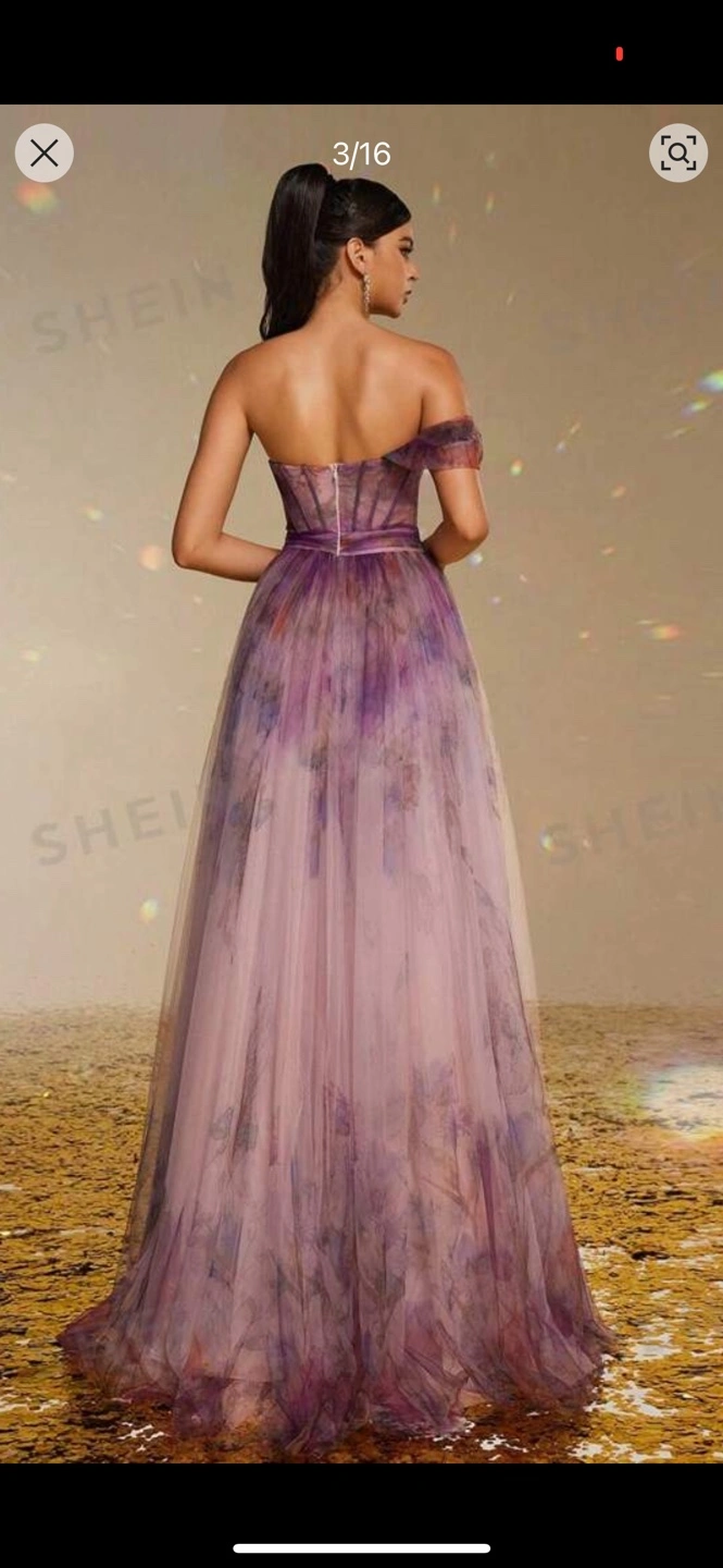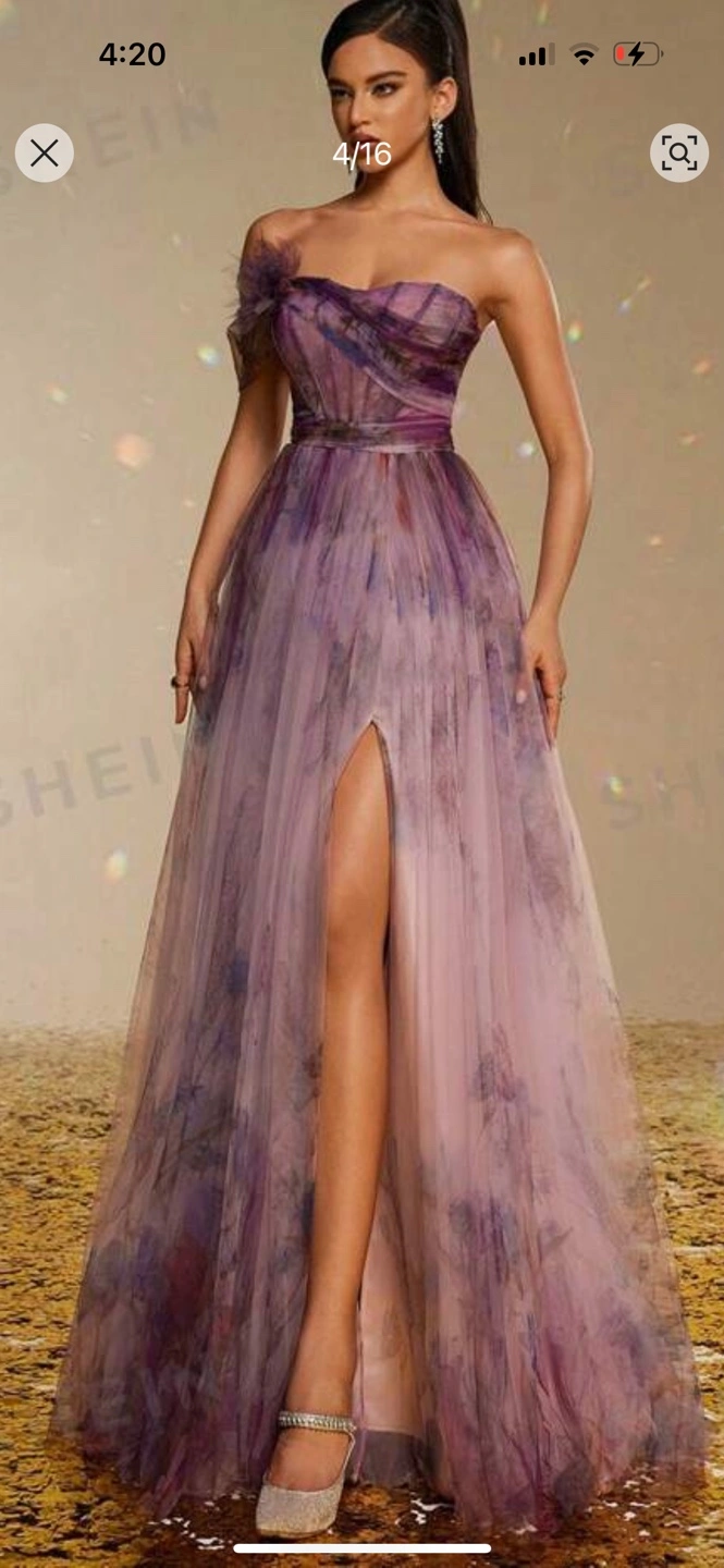 One-shoulder, strapless gown with a high slit. Features a fitted bodice and flowing tulle skirt. Floral print throughout.