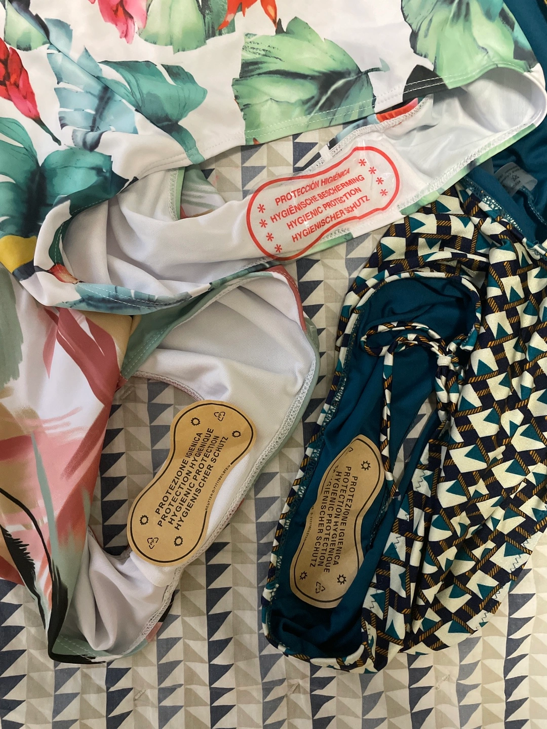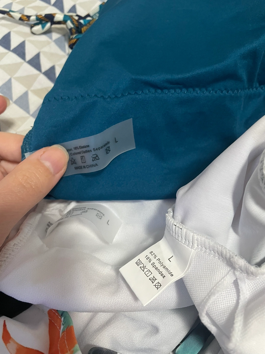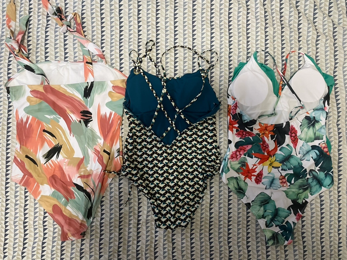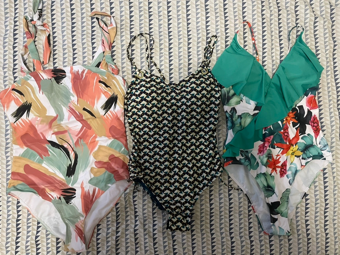 New swimsuits, all are marked as L size, but white one with abstract print is more like XL.