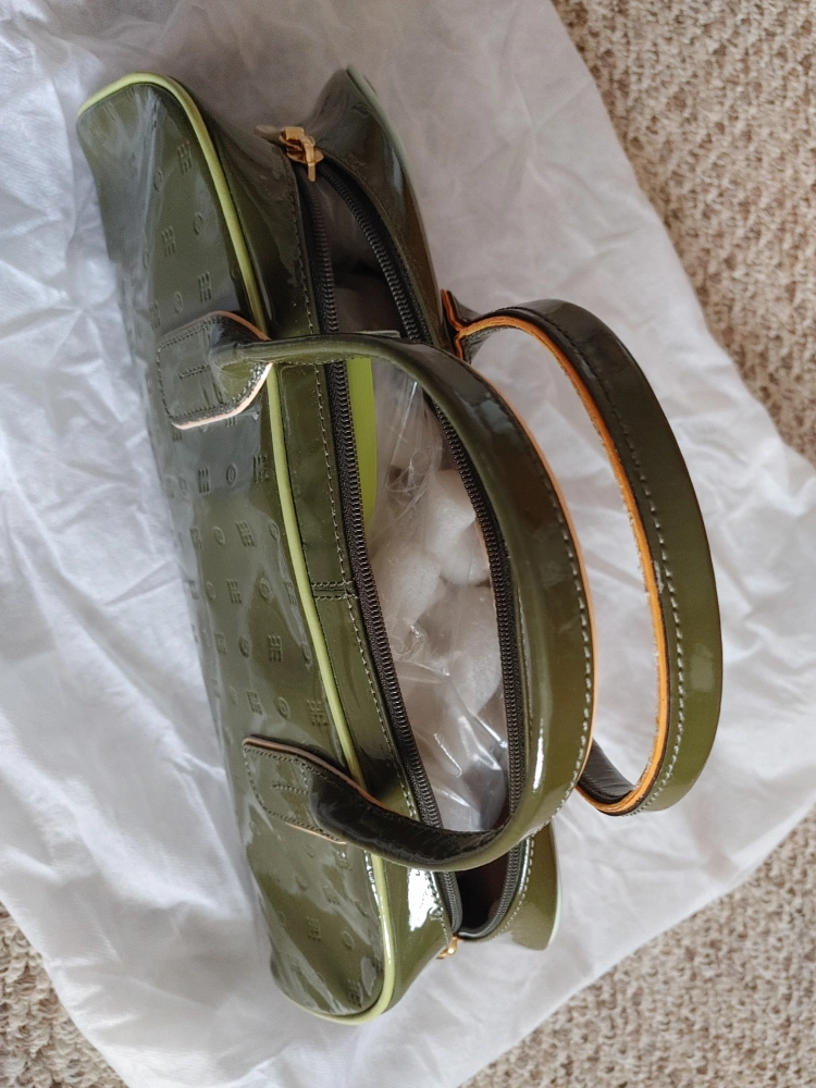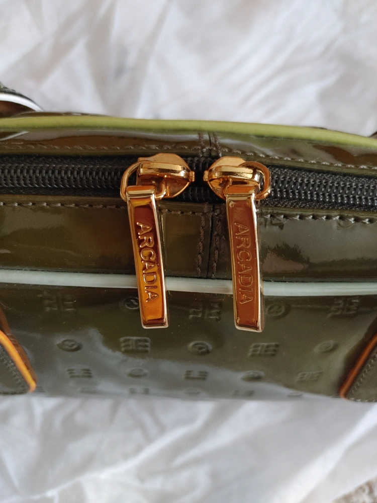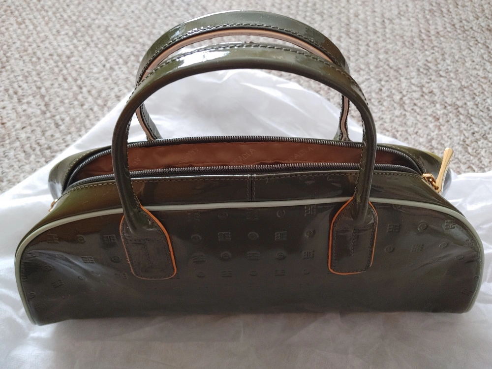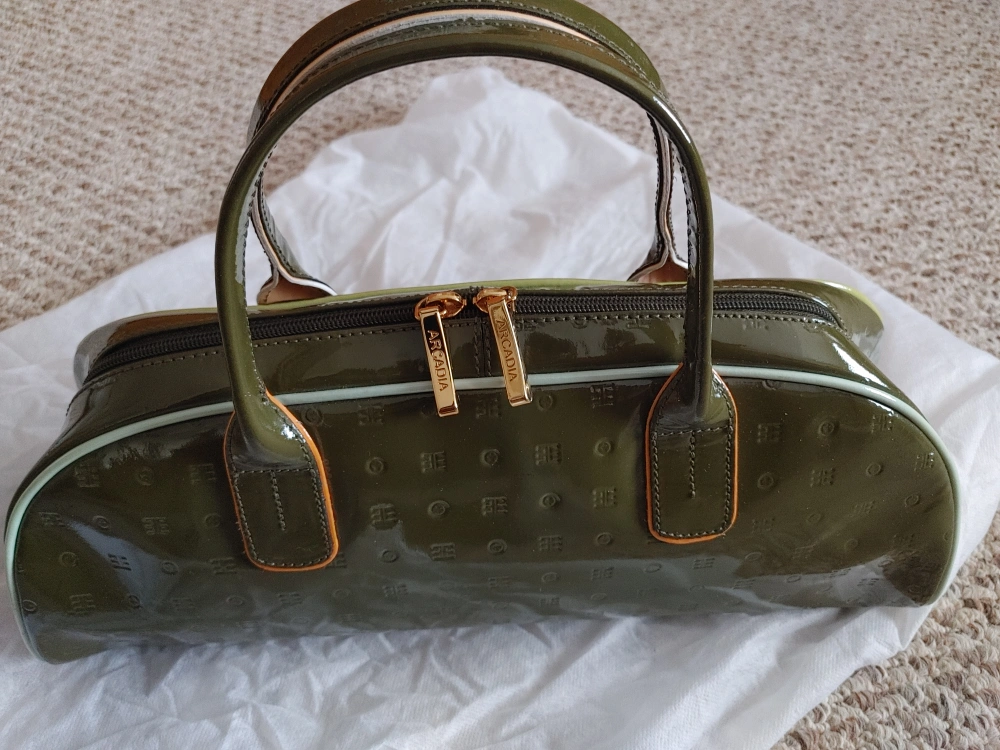 Olive Green patent leather handbag with double top handles. Couture collection.Features gold toned hardware and a repeating embossed pattern.Interior fabric has Arcadia sinature.Colour - Dark olive with multiple colors accents: orange" light blue, light green and pink. Very elegant and sophisticated.Dustbag included.New. Excellent condition.