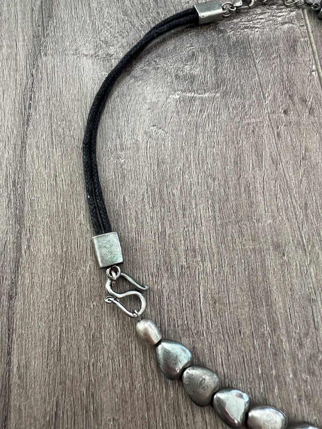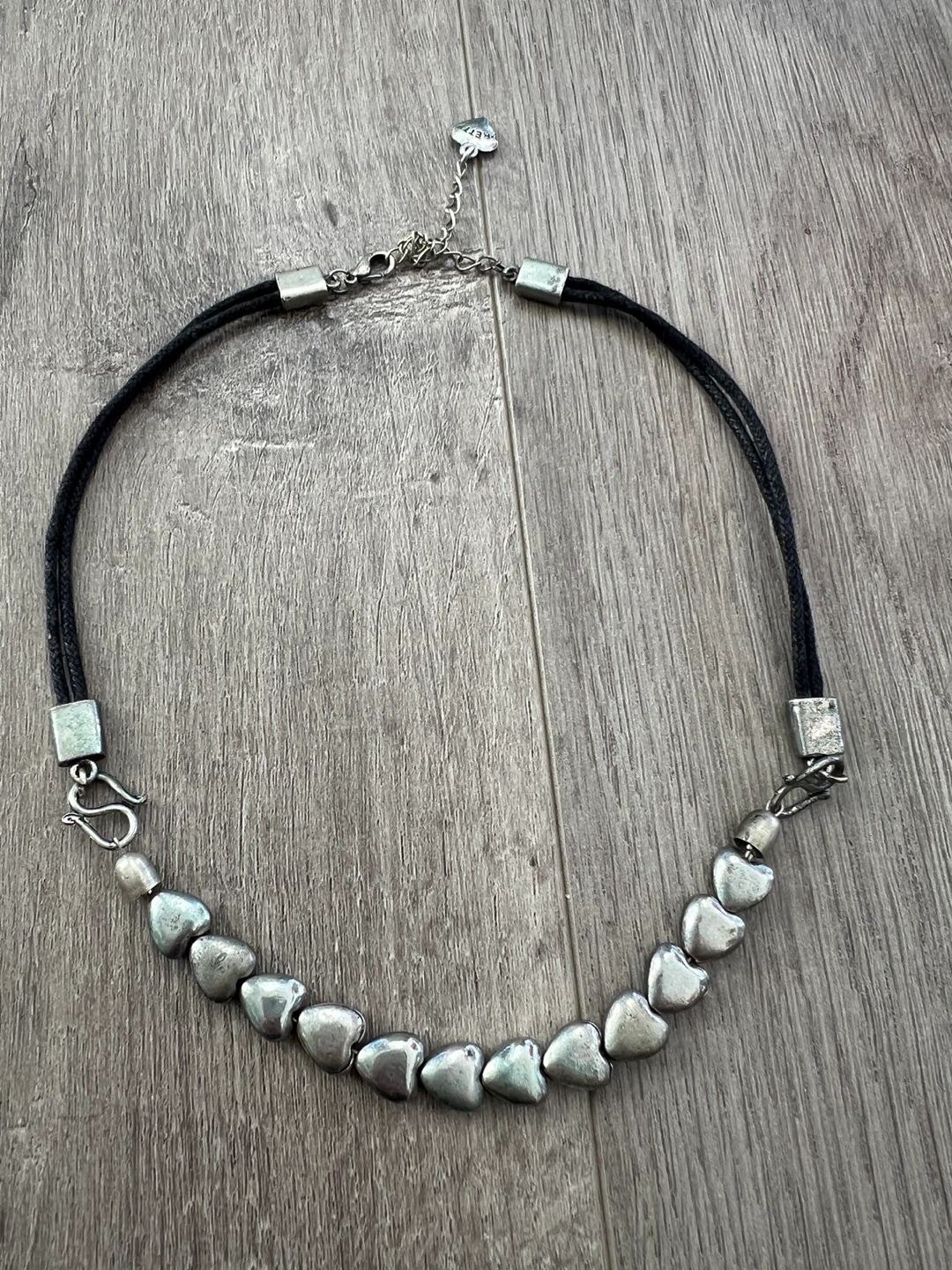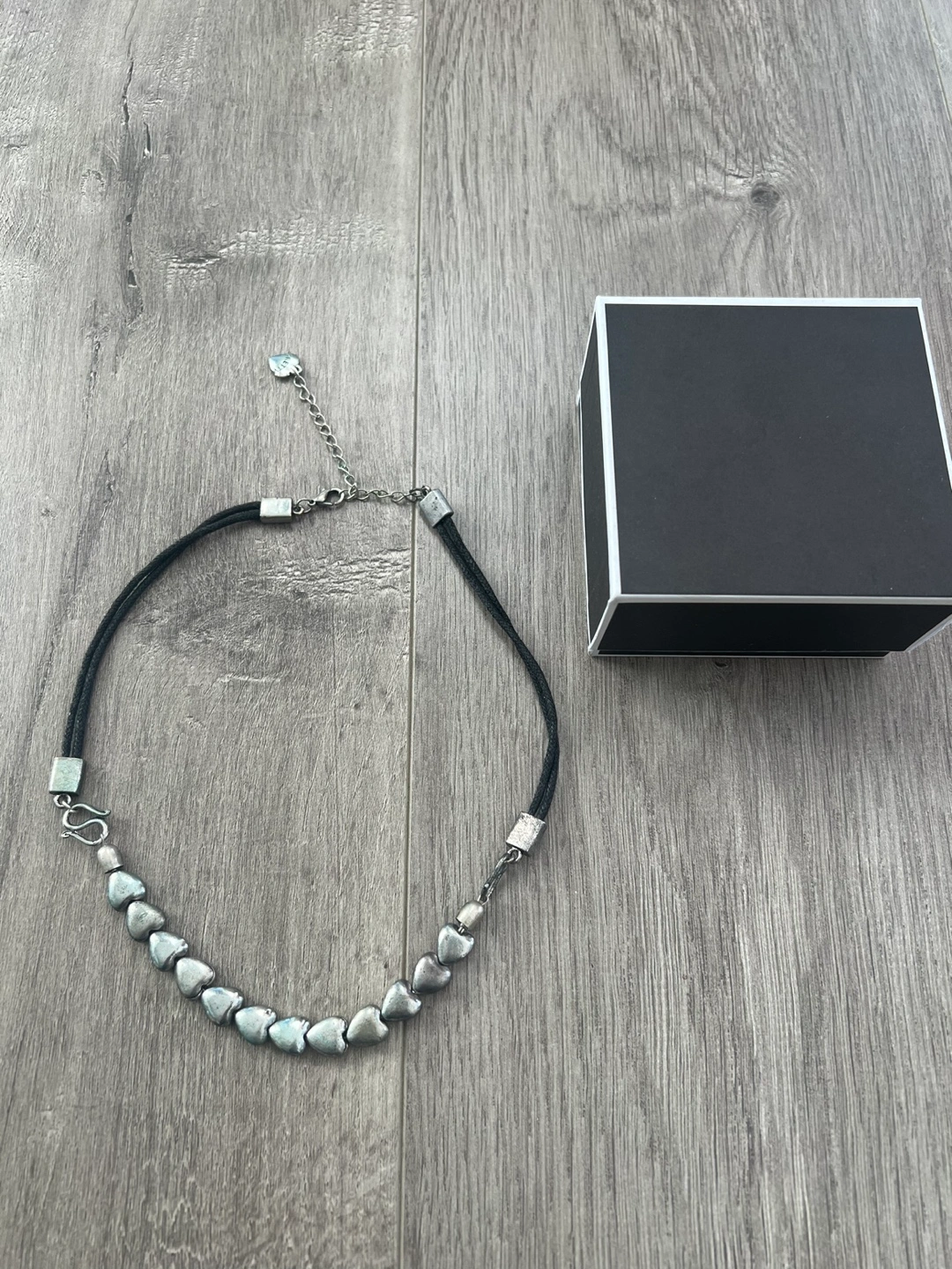 170Black cord necklace with silver metallic hearts beads. Includes box.