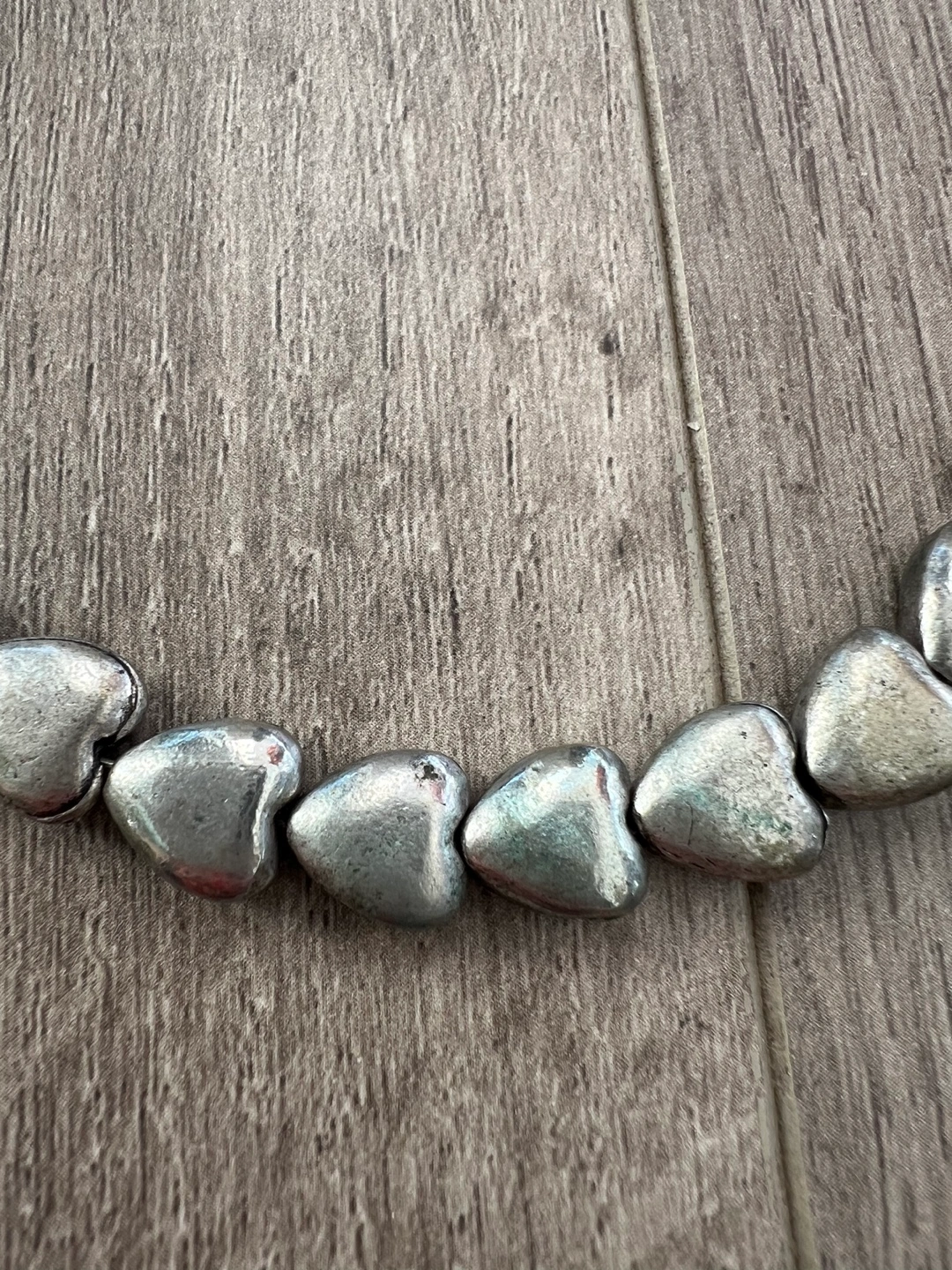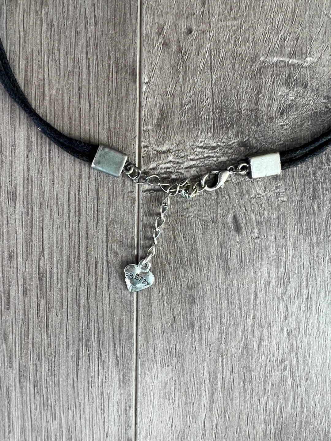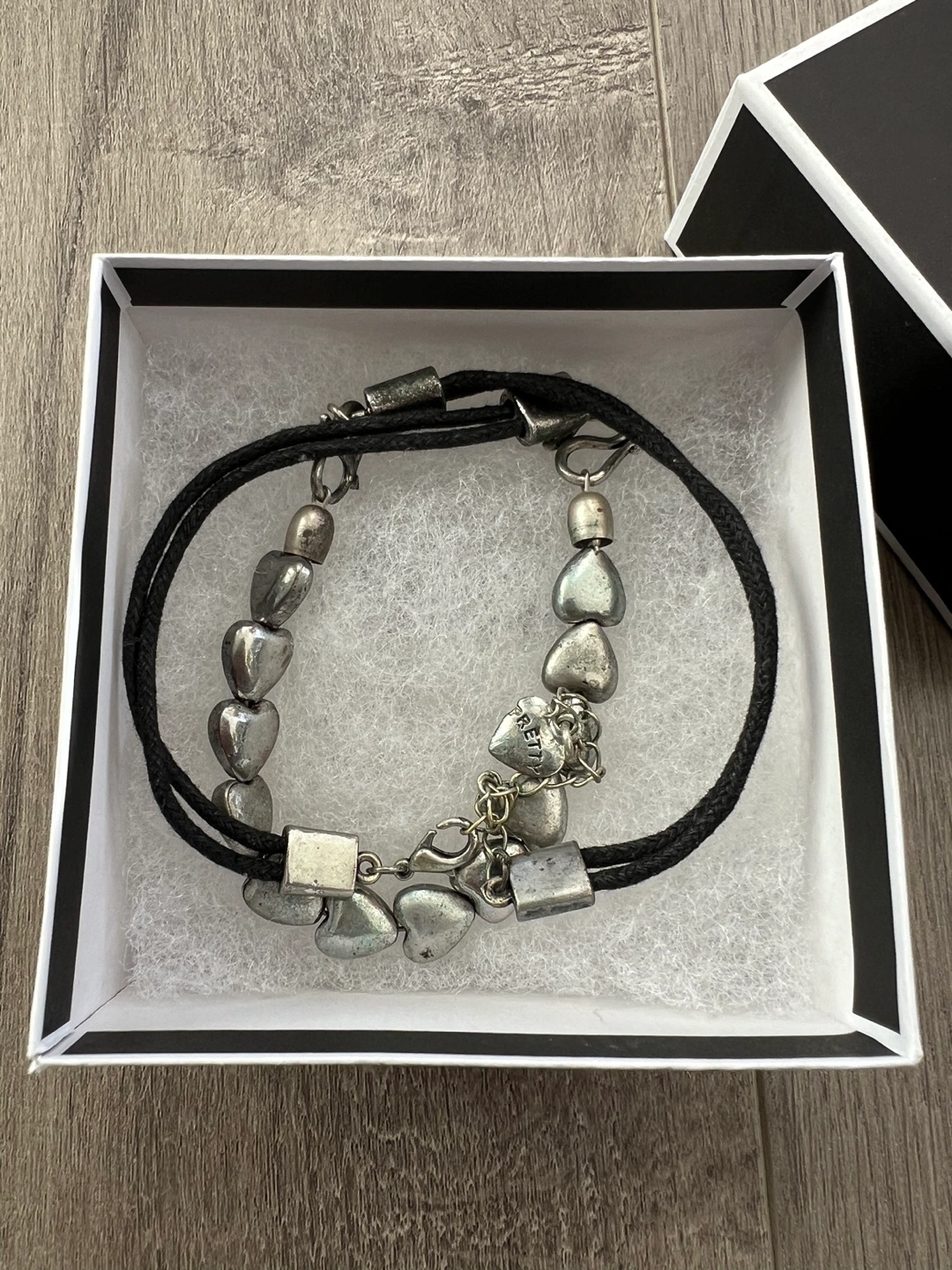 170Black cord necklace with silver metallic hearts beads. Includes box.