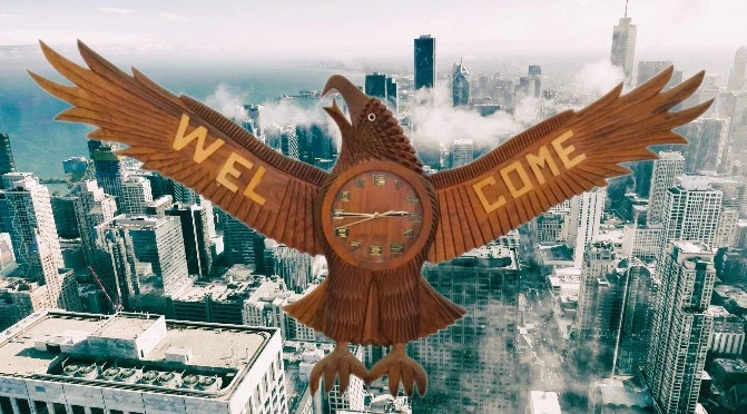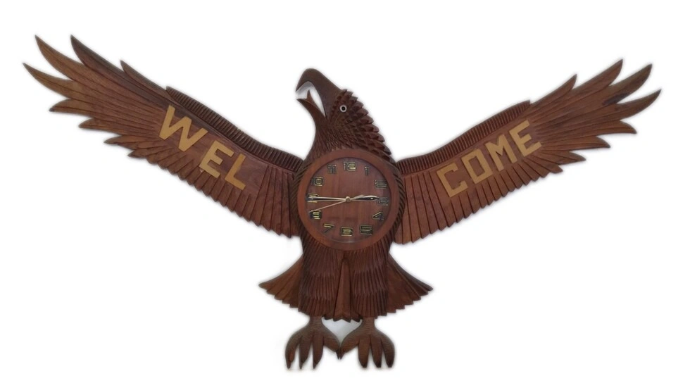 Eagle Shape Carved wood wall clock with welcome inscription. The clock is like new in good condition.