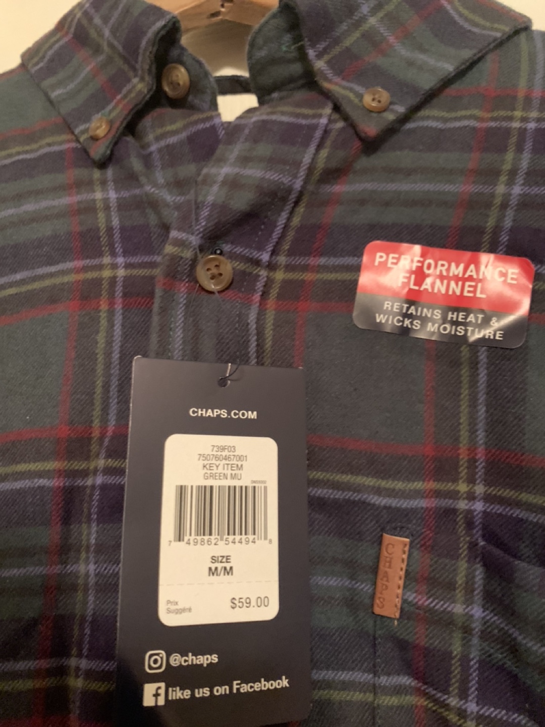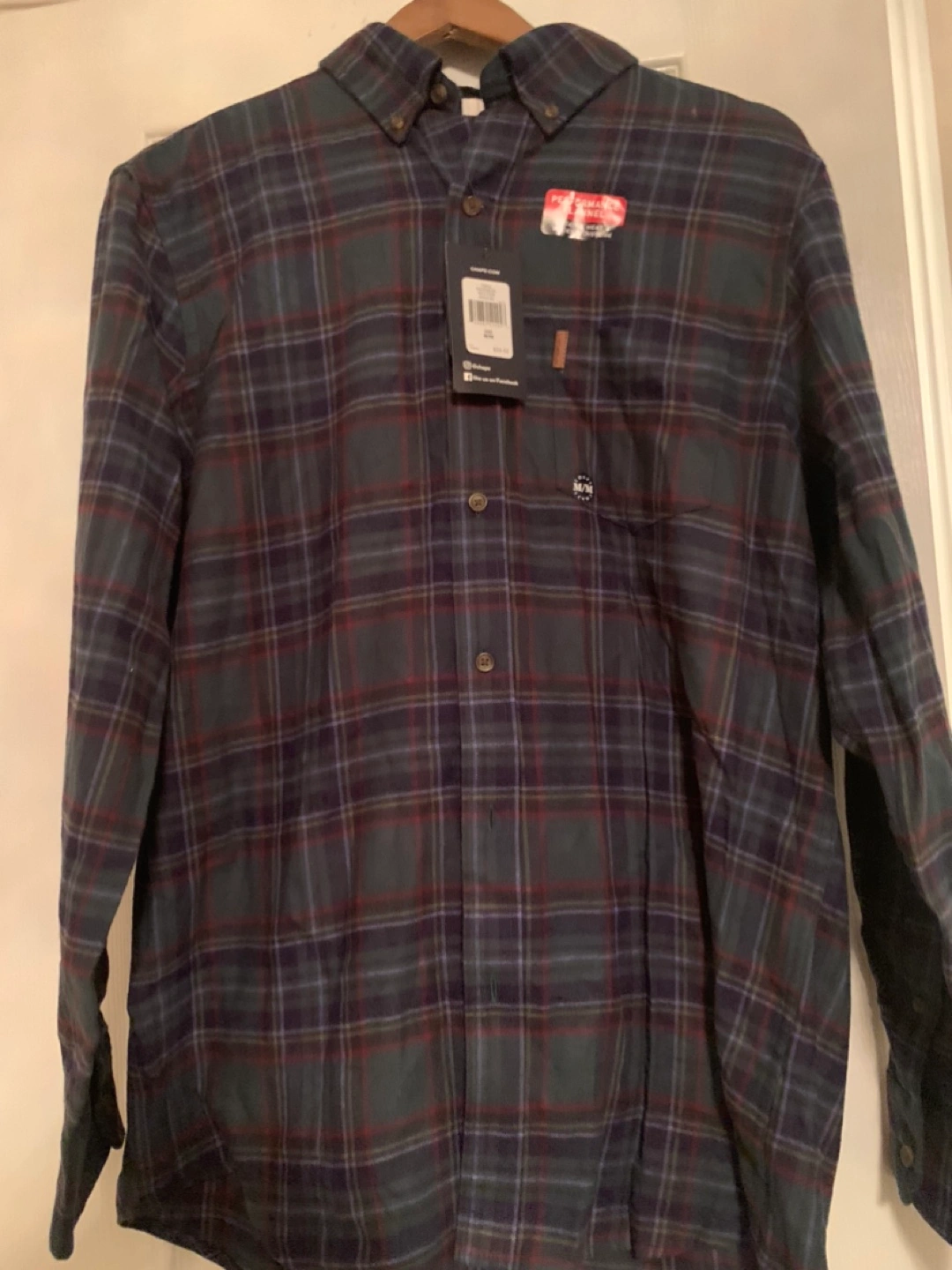 New with tags. Long sleeve plaid flannel shirt. Green, black and red plaid. Size M/M.
