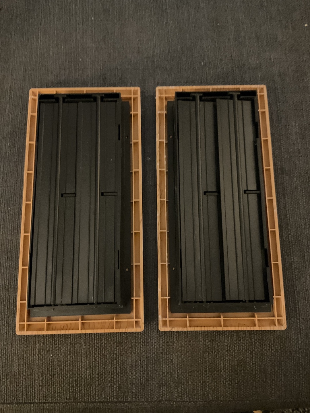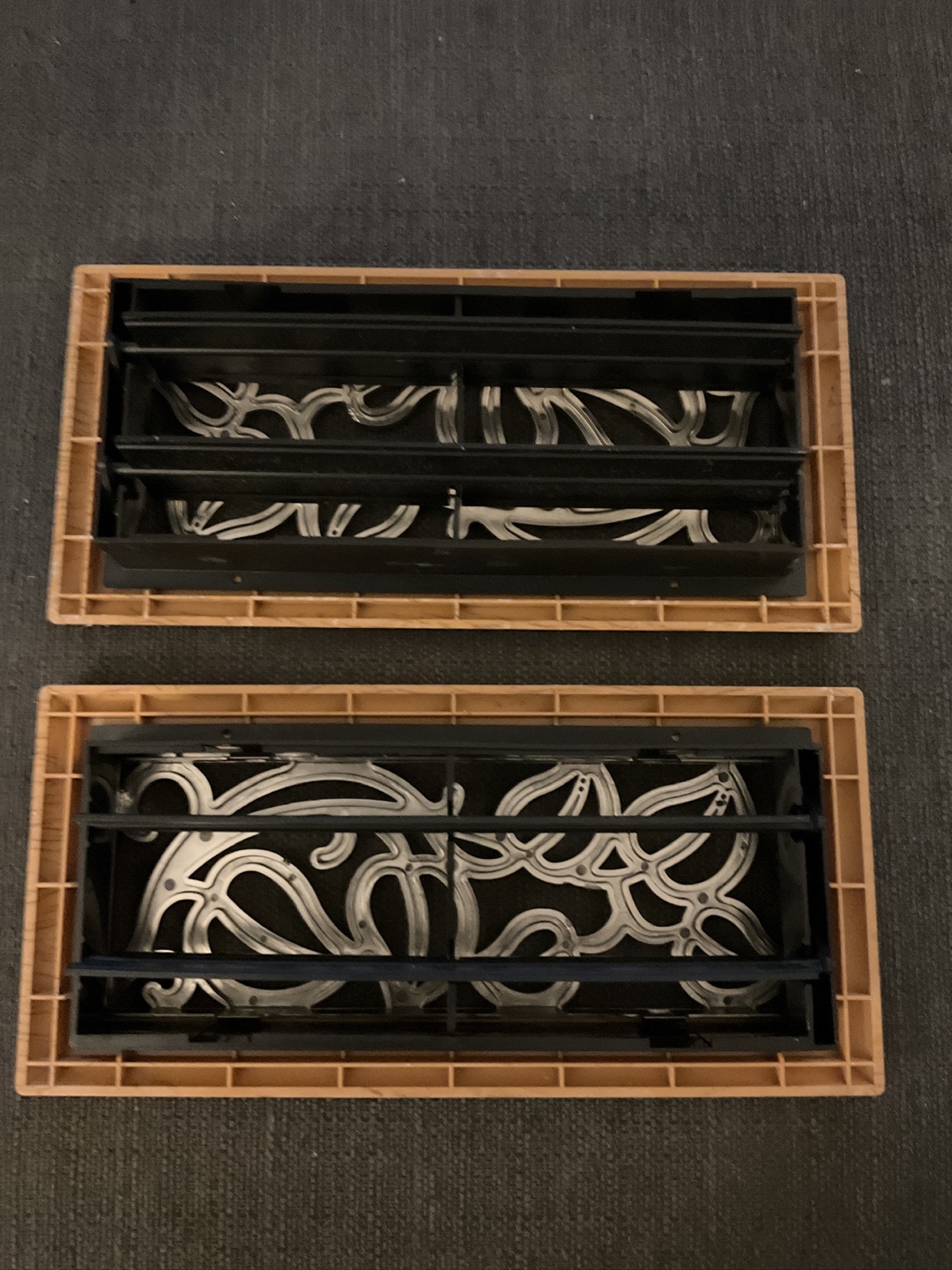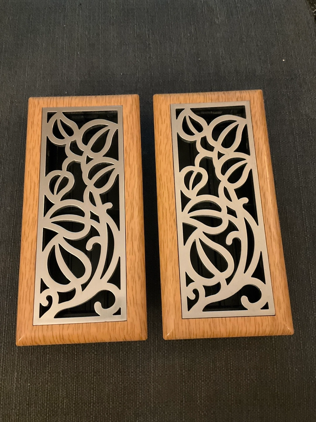 Two decorative register vents with a wood frame and metal design. The vents can be opened and closed for airflow control.