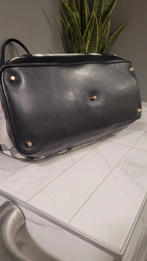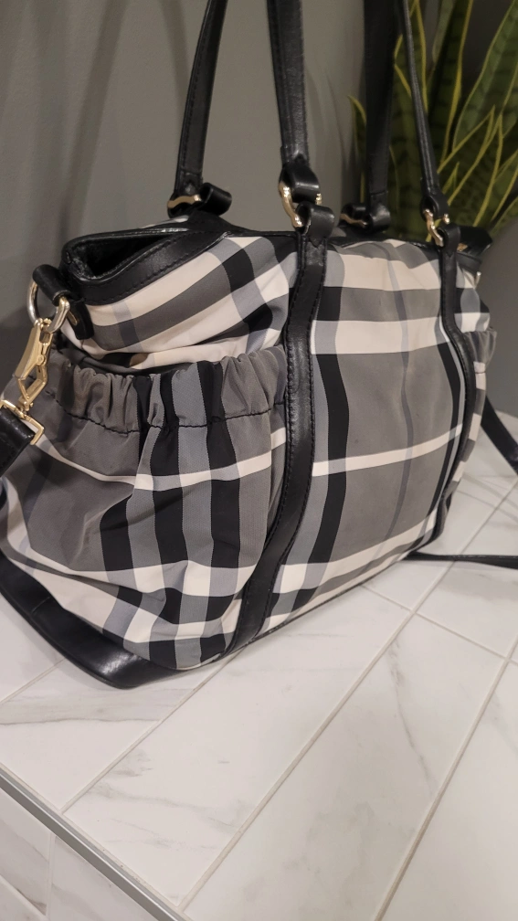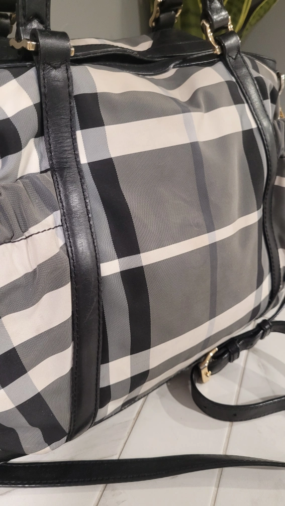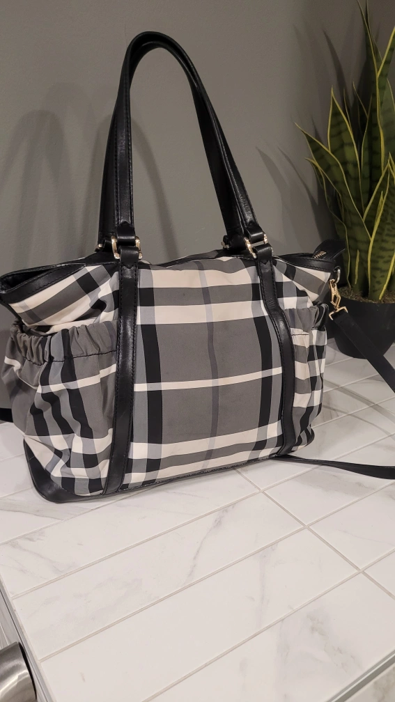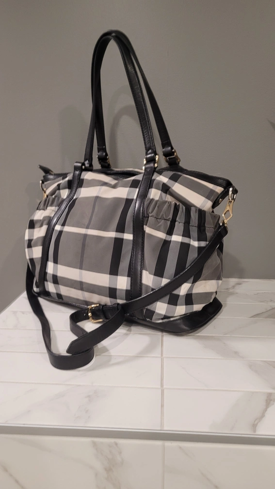 Burberry Black and white check tote bag with leather trim and a detachable shoulder strap. Gold coloured hardware.