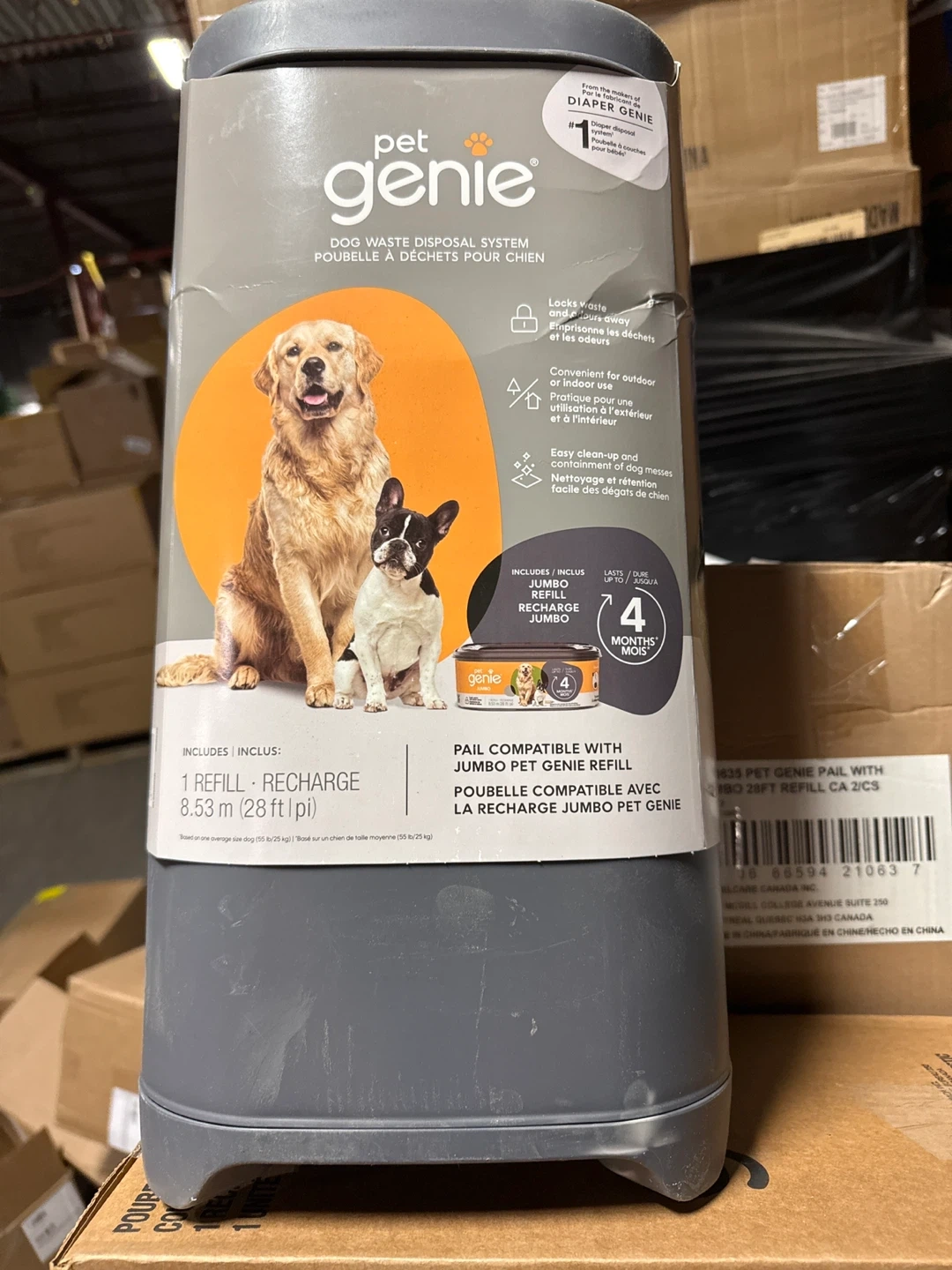 This Pet Genie system is designed for dog waste disposal, locking away odours and messes. It's convenient for outdoor or indoor use, offering easy clean-up. The included jumbo refill is 8.53m (28 ft) long.