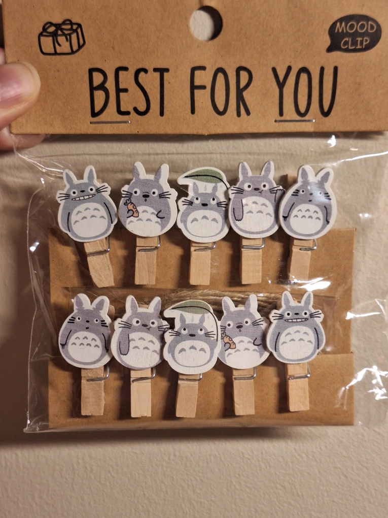 Set of 10 wooden clips with Totoro designs. Perfect for hanging notes, photos, or other mementos. brand new in sealed package.