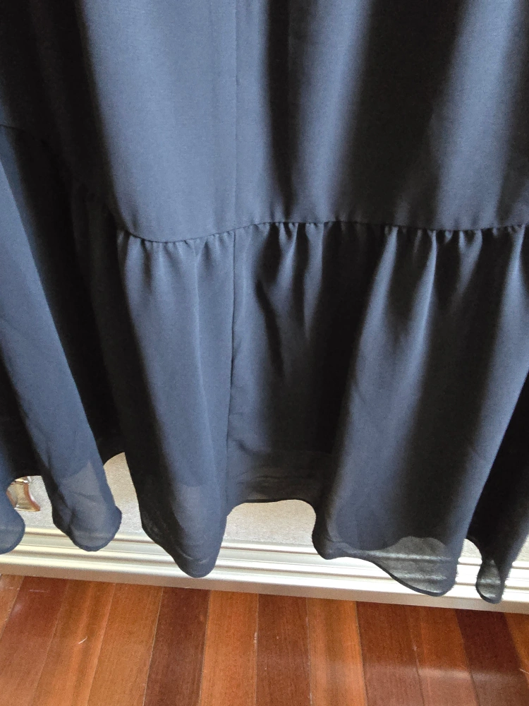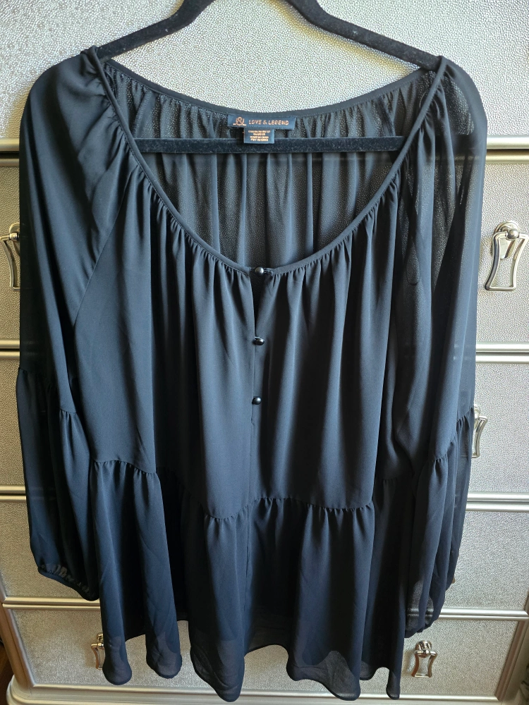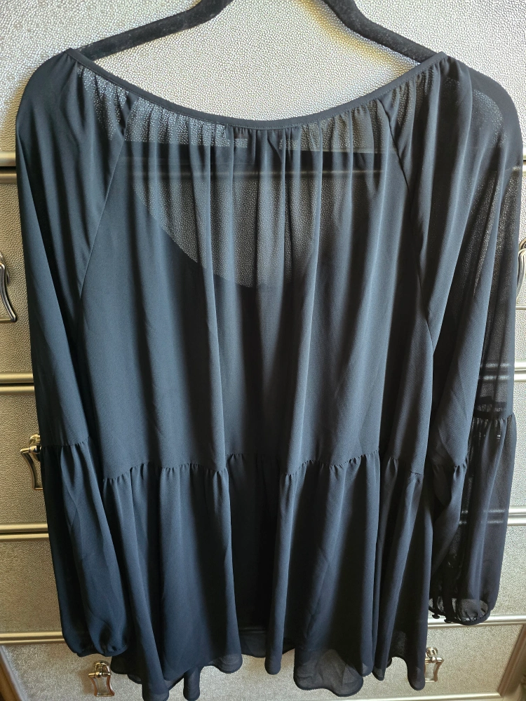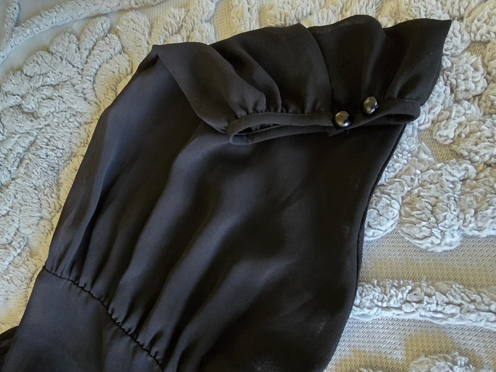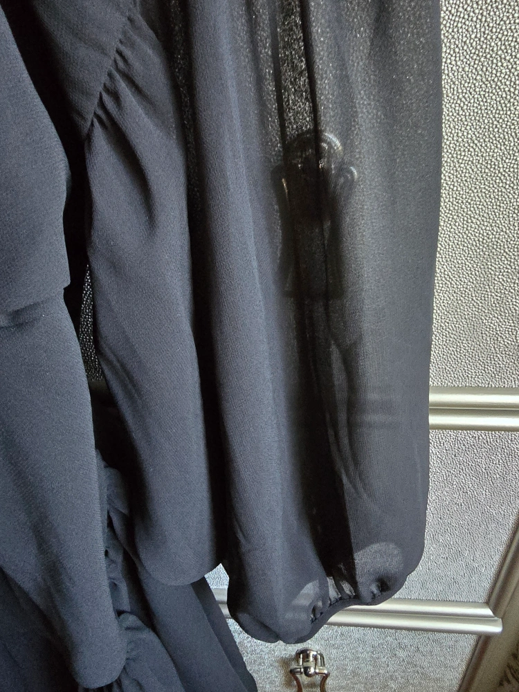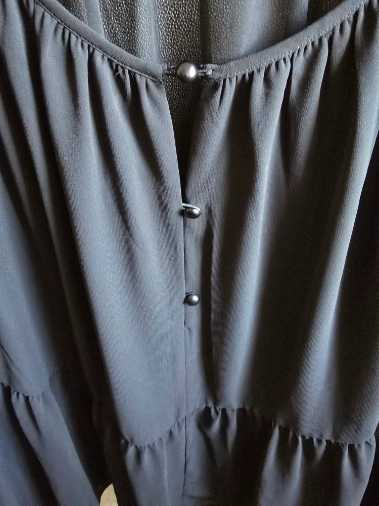 113Black long-sleeved blouse with a tiered skirt. Button closure at the neck. Sheer fabric.