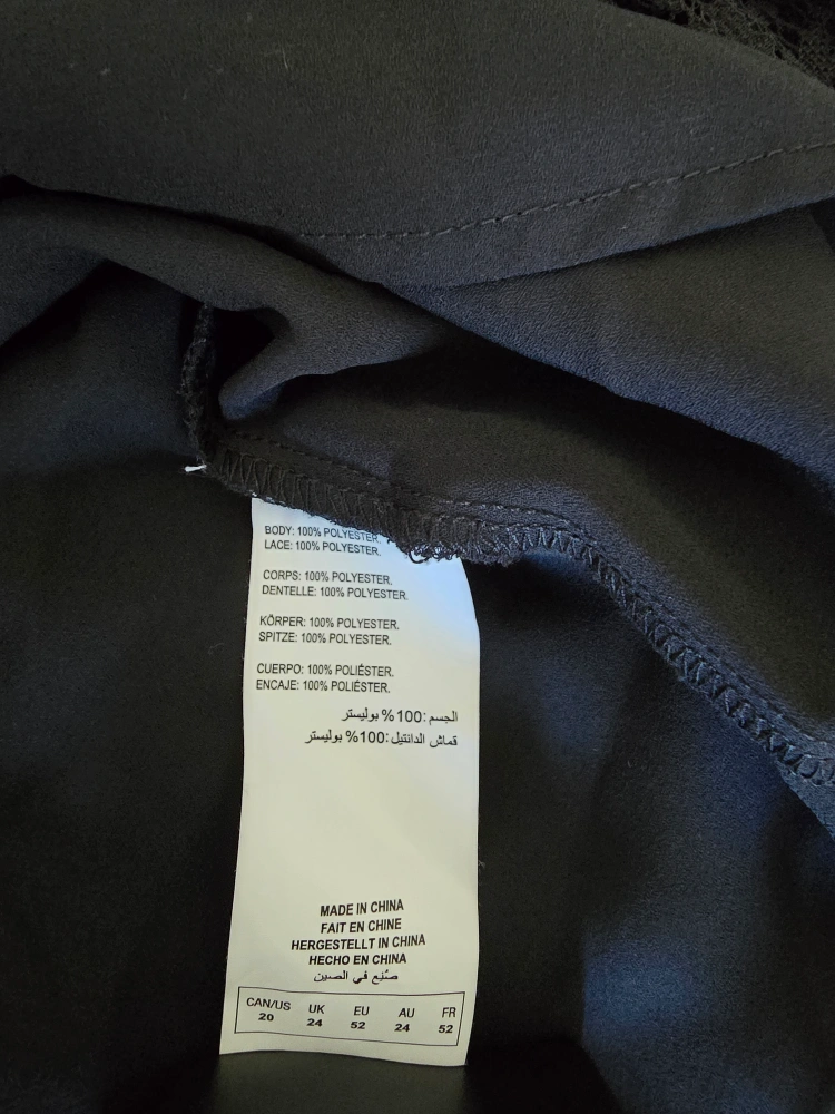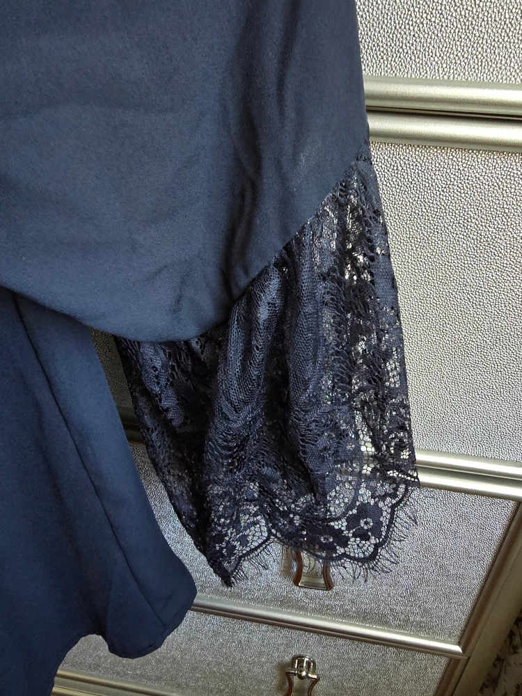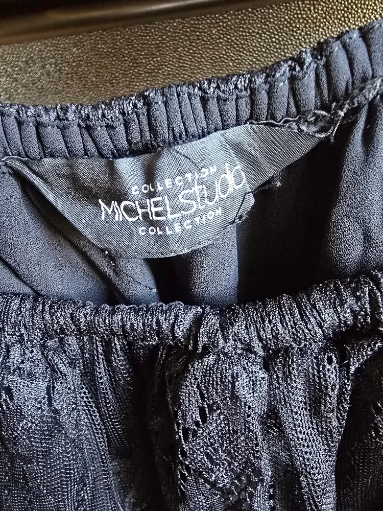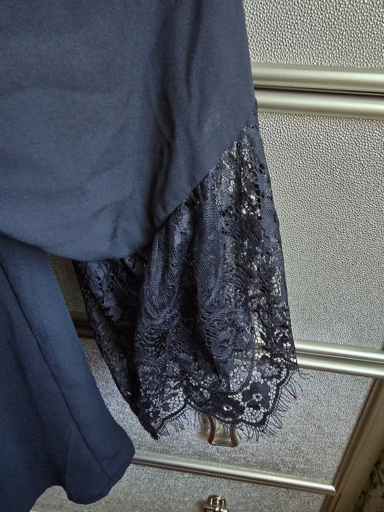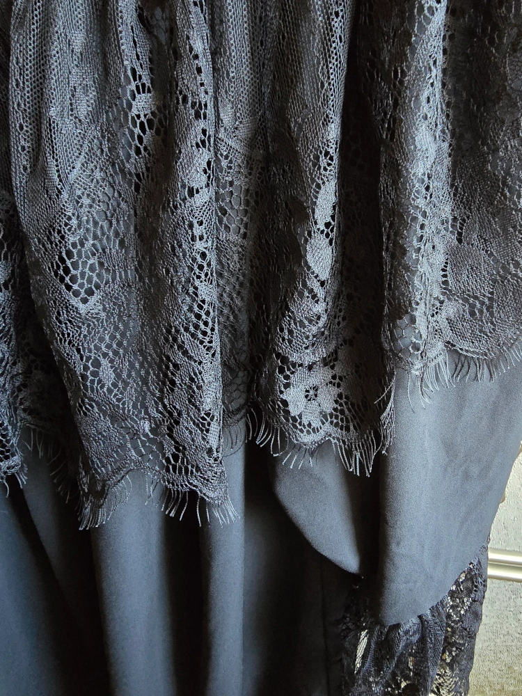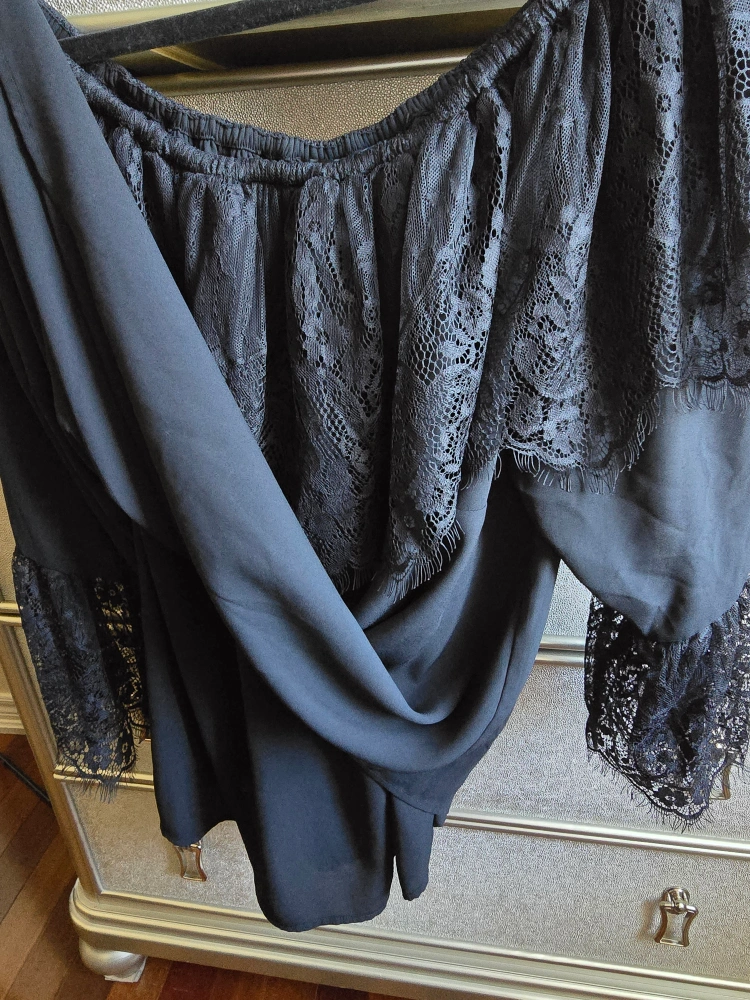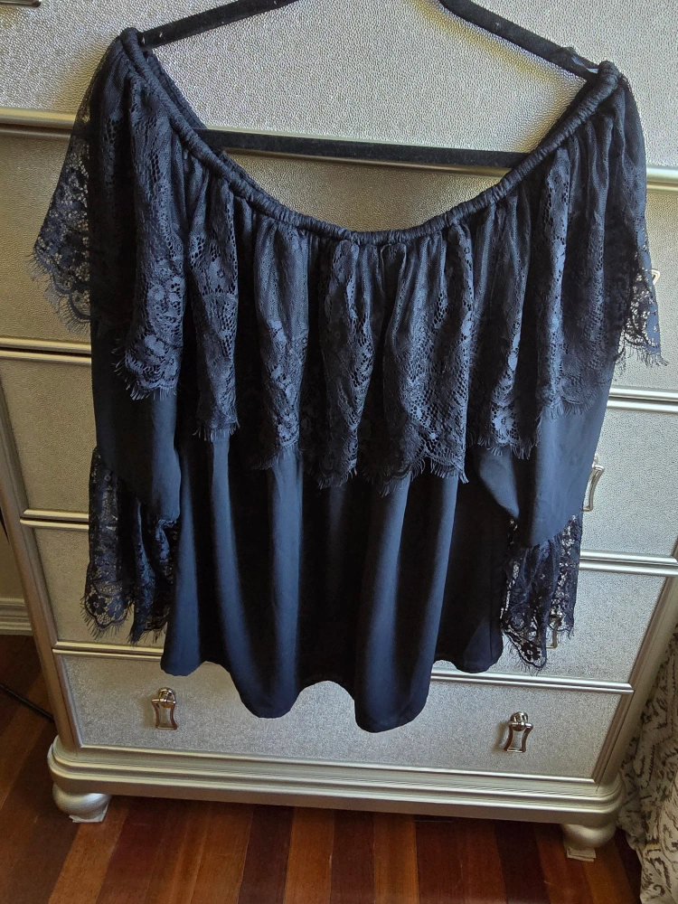 113Black off the shoulder blouse with lace trim around the neckline and sleeves. 3/4 length sleeves.
