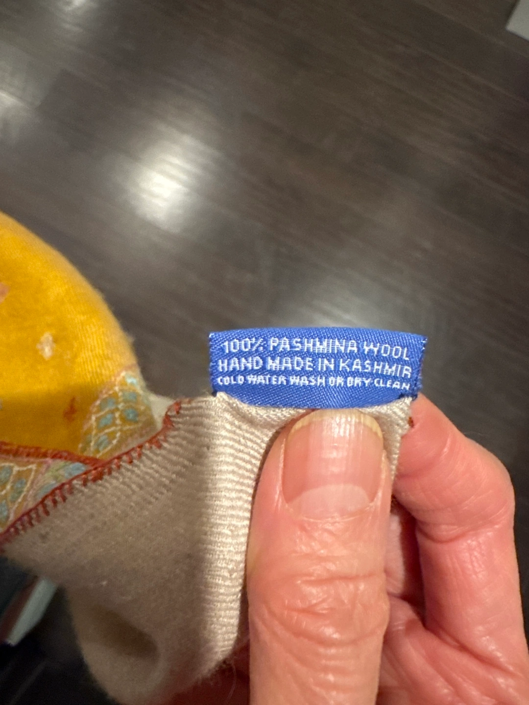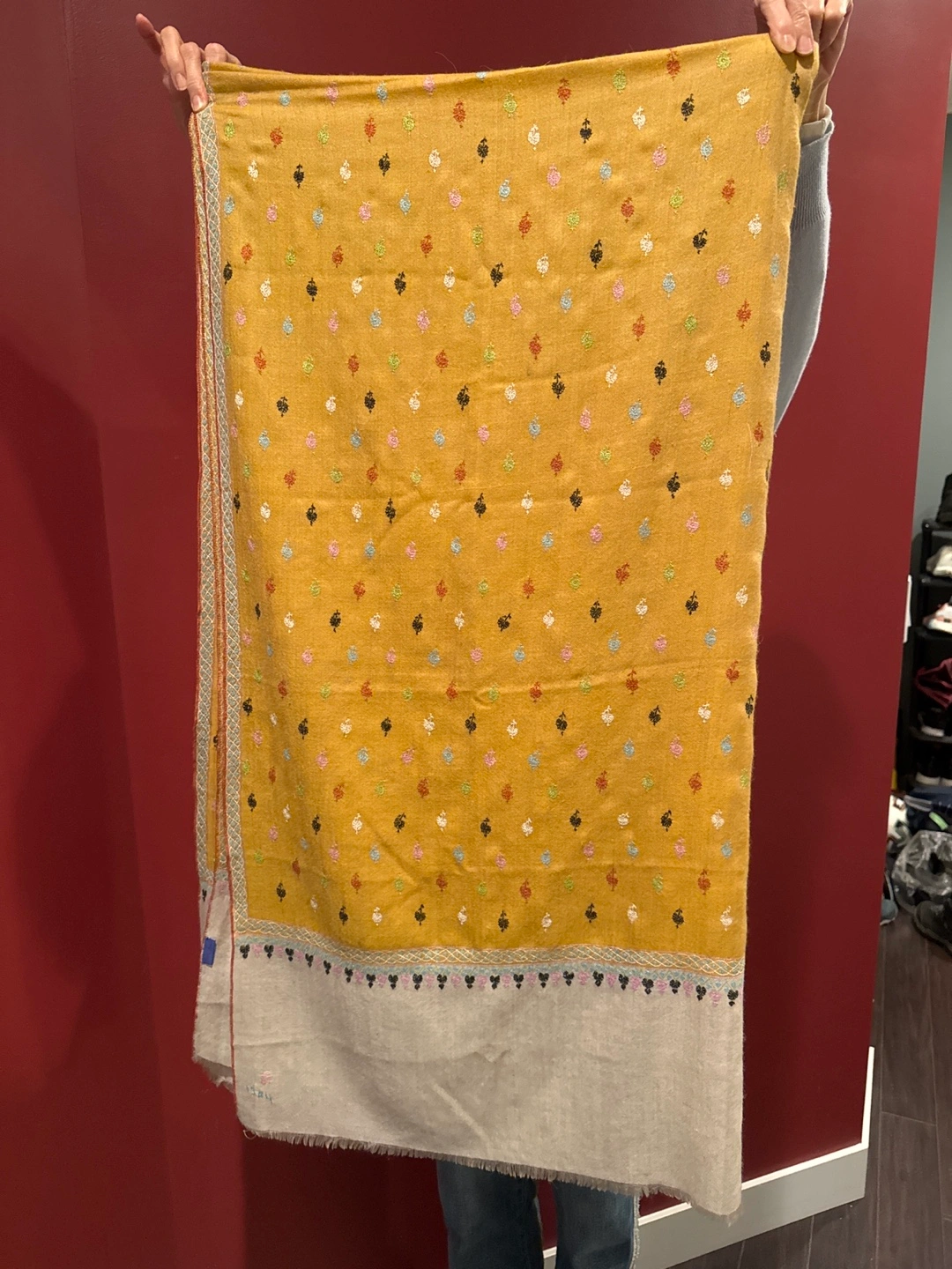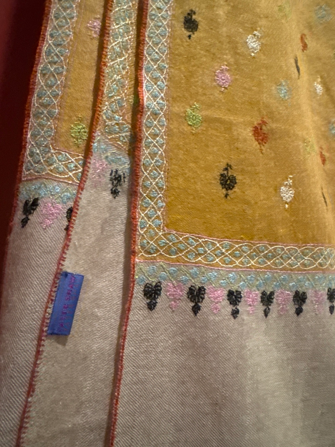 Crafted of a luxurious pashmina, these shawls are hand made in an intricate process involving 36 steps and skilled artisans. These heirloom pieces begin as hand-spun thread, then woven into unique patterns and finished with embroidery. Each shawl is hand-stitched with a signature of the artisan.