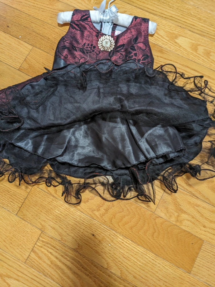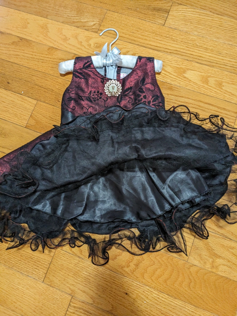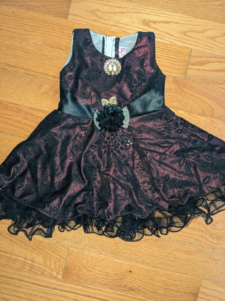 Burgundy dress with black floral pattern and black ribbon. Features a black tulle skirt and a jewel-encrusted flower on the bodice. Back zipper closure.