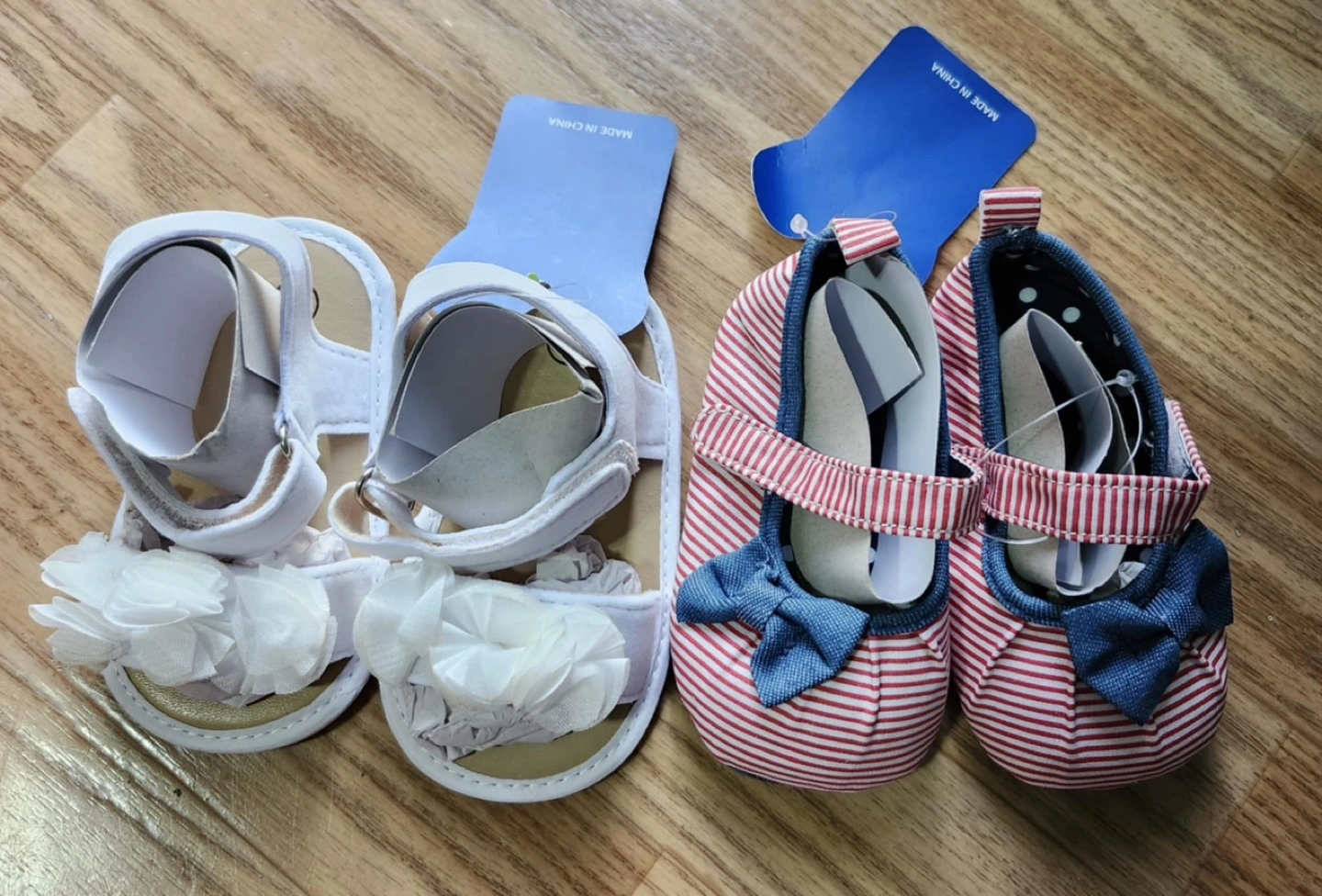Two pairs of baby girl's shoes, one pair is sandals with white flowers, and the other pair is red and white striped shoes with a blue bow.