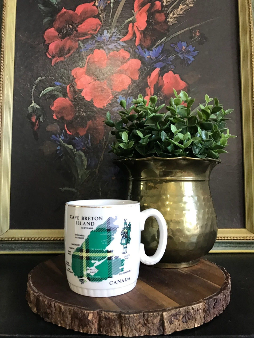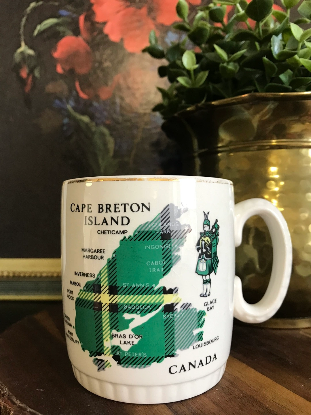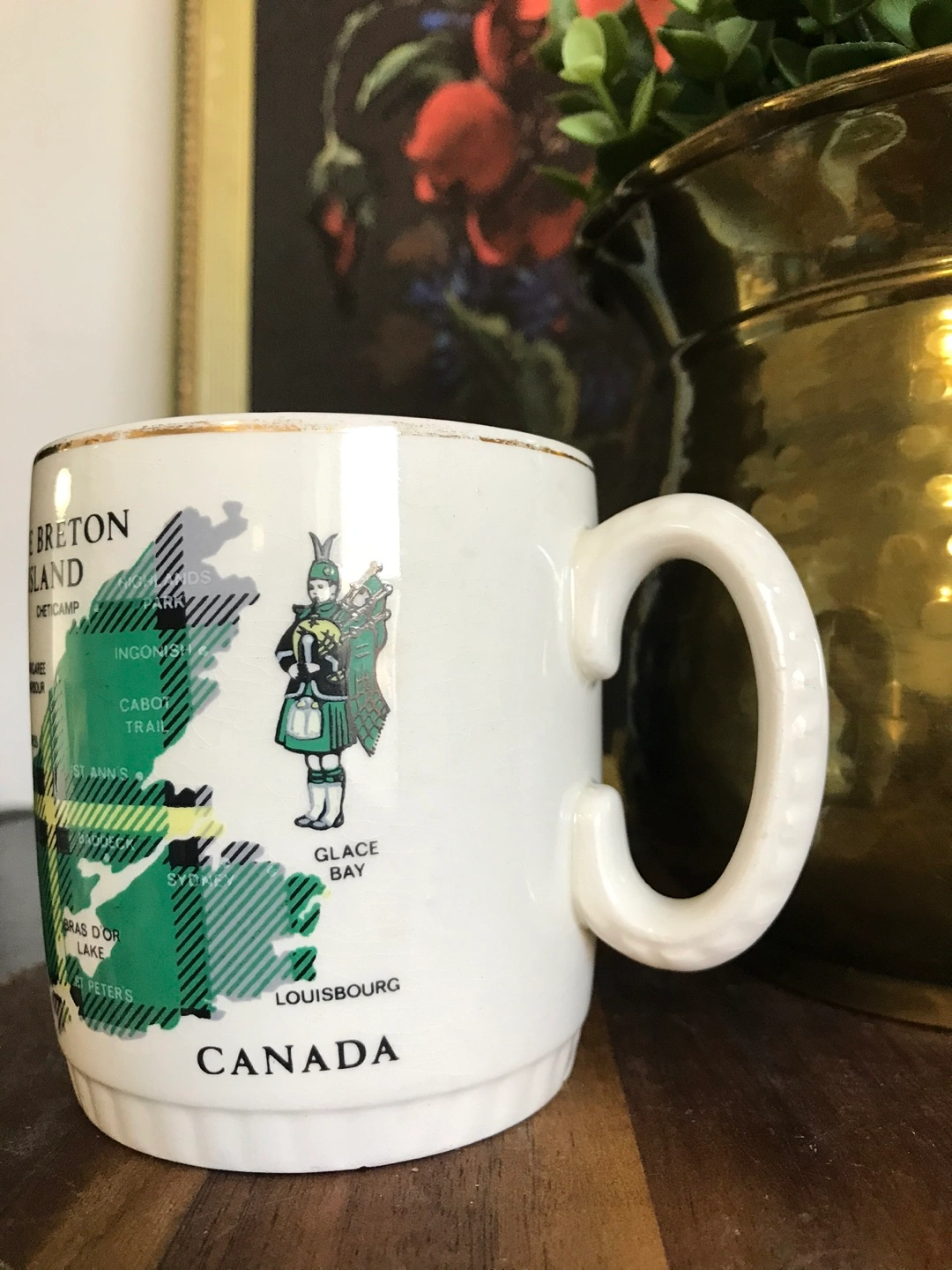 White mug with gold trim, depicting a map of Cape Breton Island with tartan plaid. Features a piper in traditional dress.