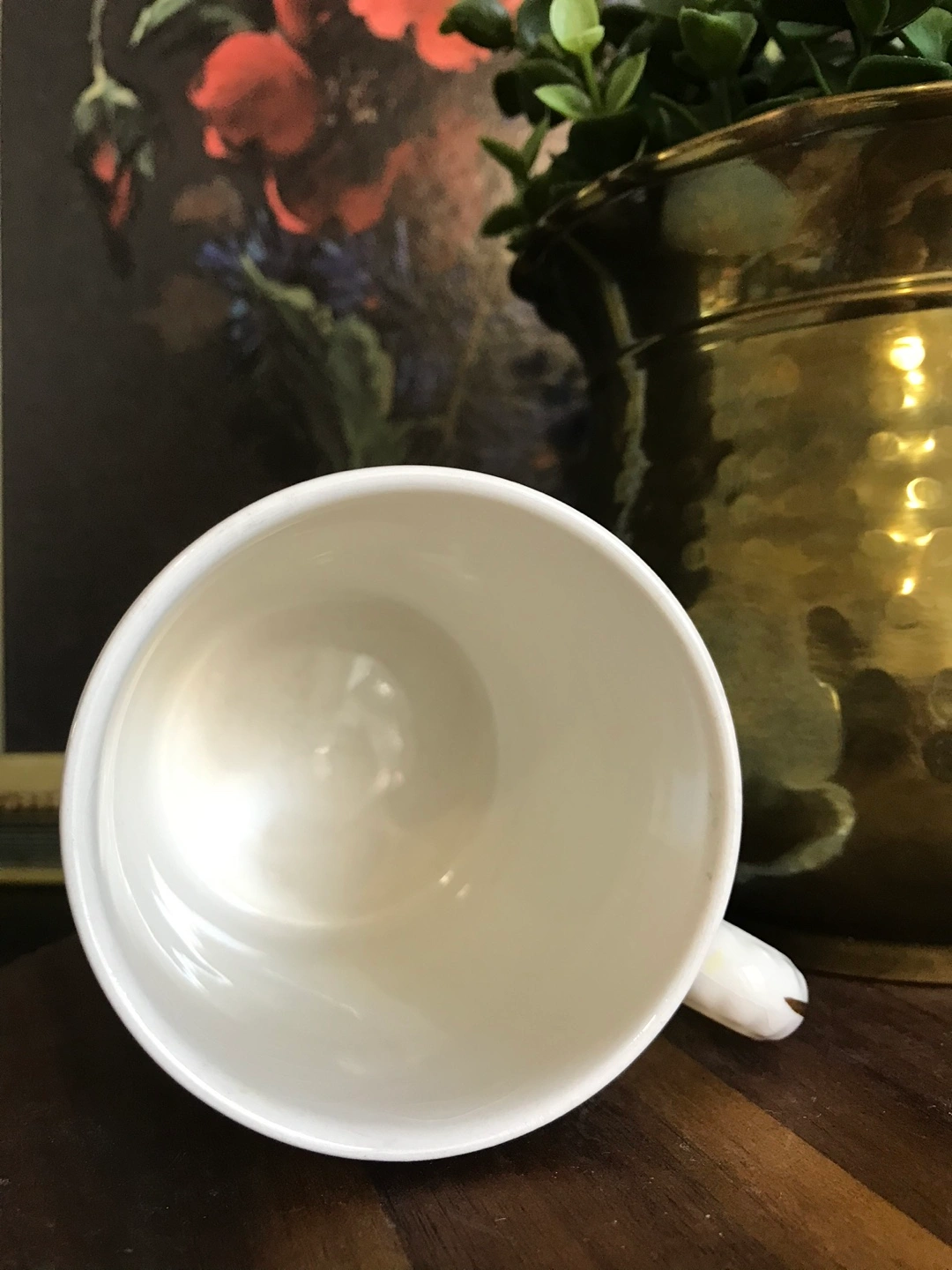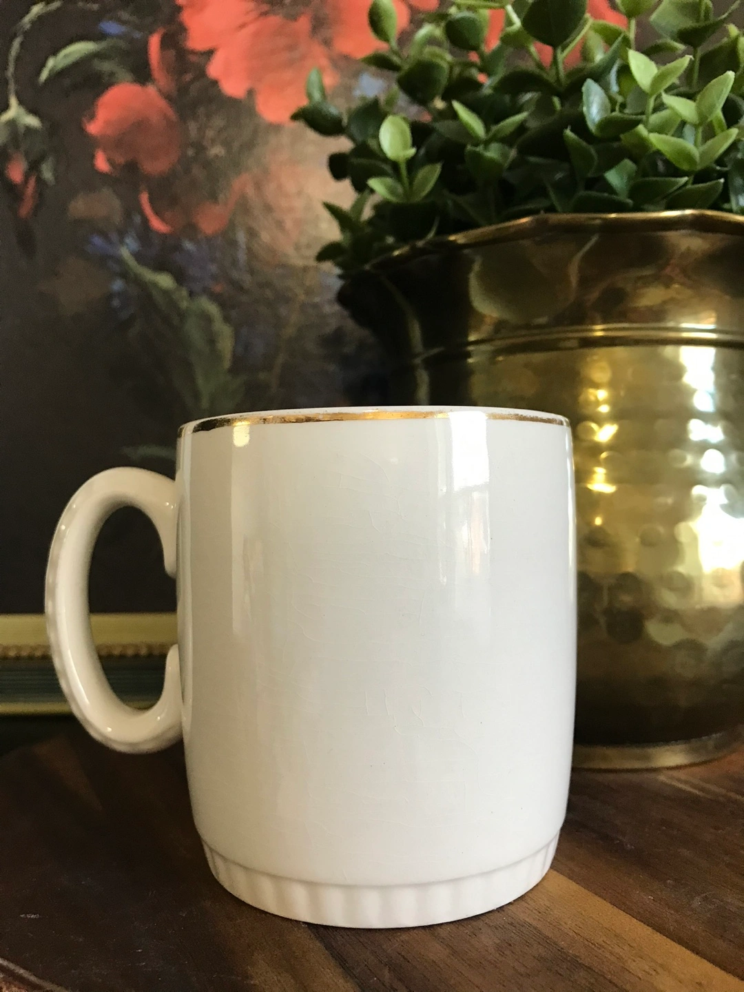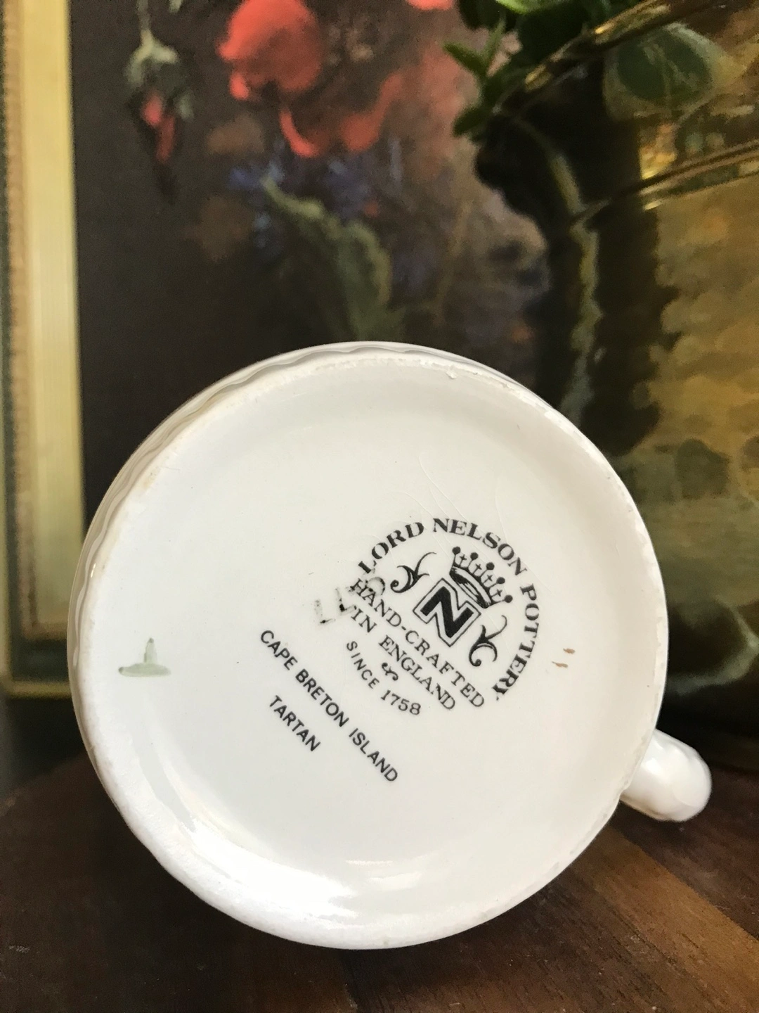 White mug with gold trim, depicting a map of Cape Breton Island with tartan plaid. Features a piper in traditional dress.
