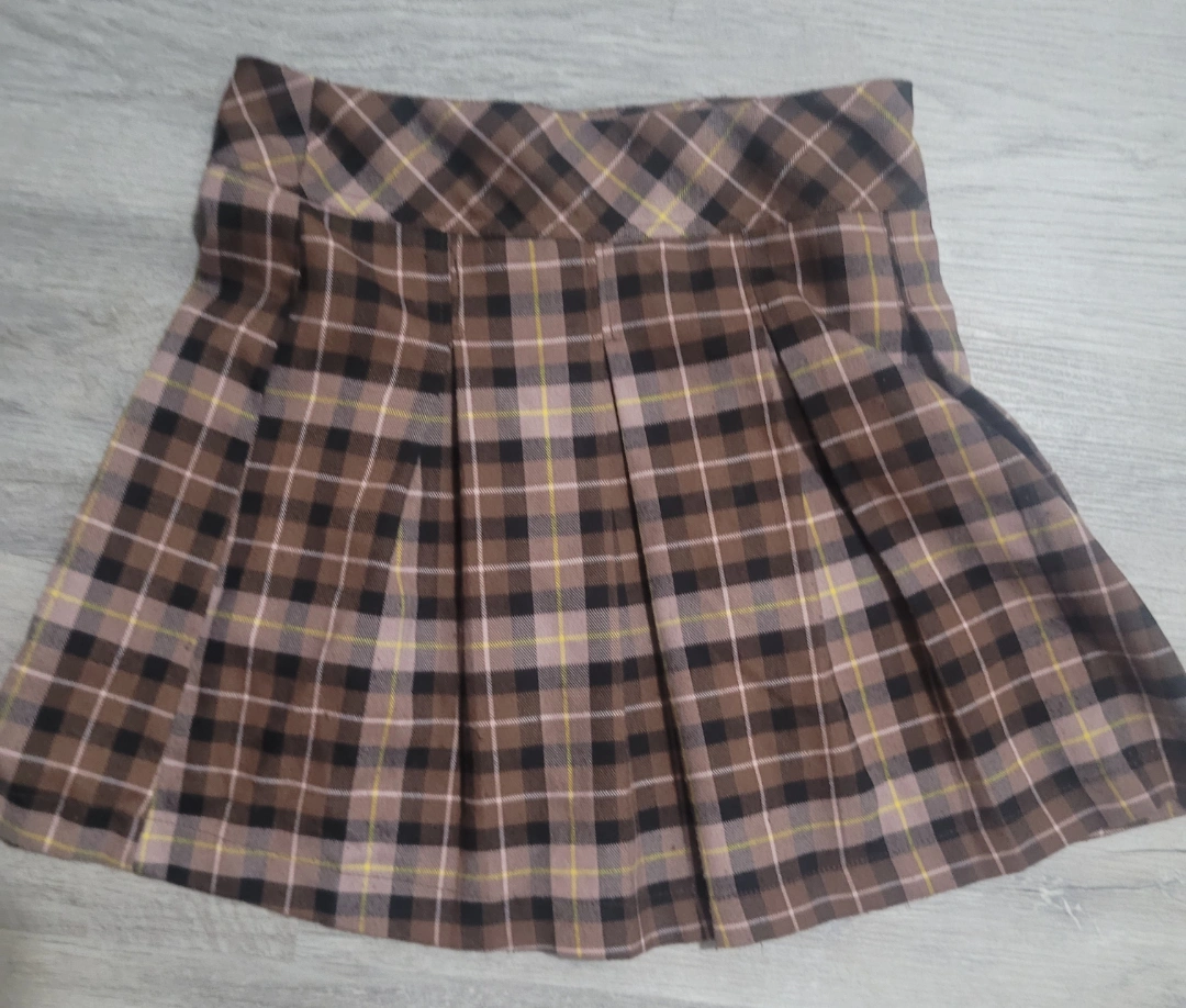Brown, black, and yellow plaid skirt. Pleated and has a high waist.