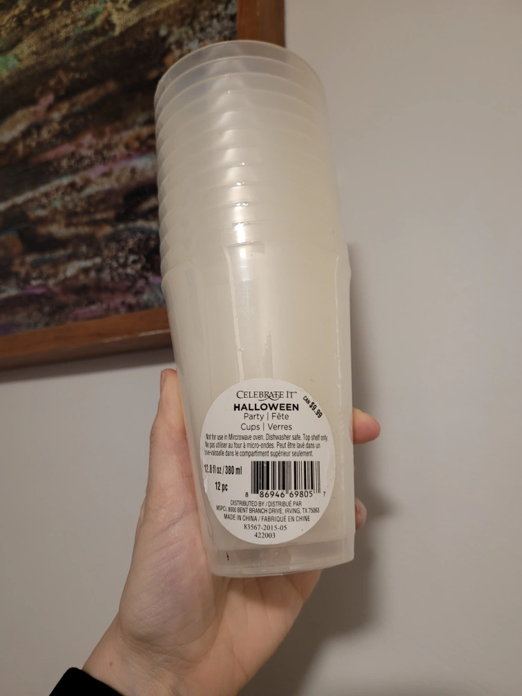 Set of 12 clear plastic cups. Each cup has a drink up witches design on the front. 12 oz. Brand new and unused. paid 9.99 plus tax ...about $11.20... never used it, asking less then what i paid.
