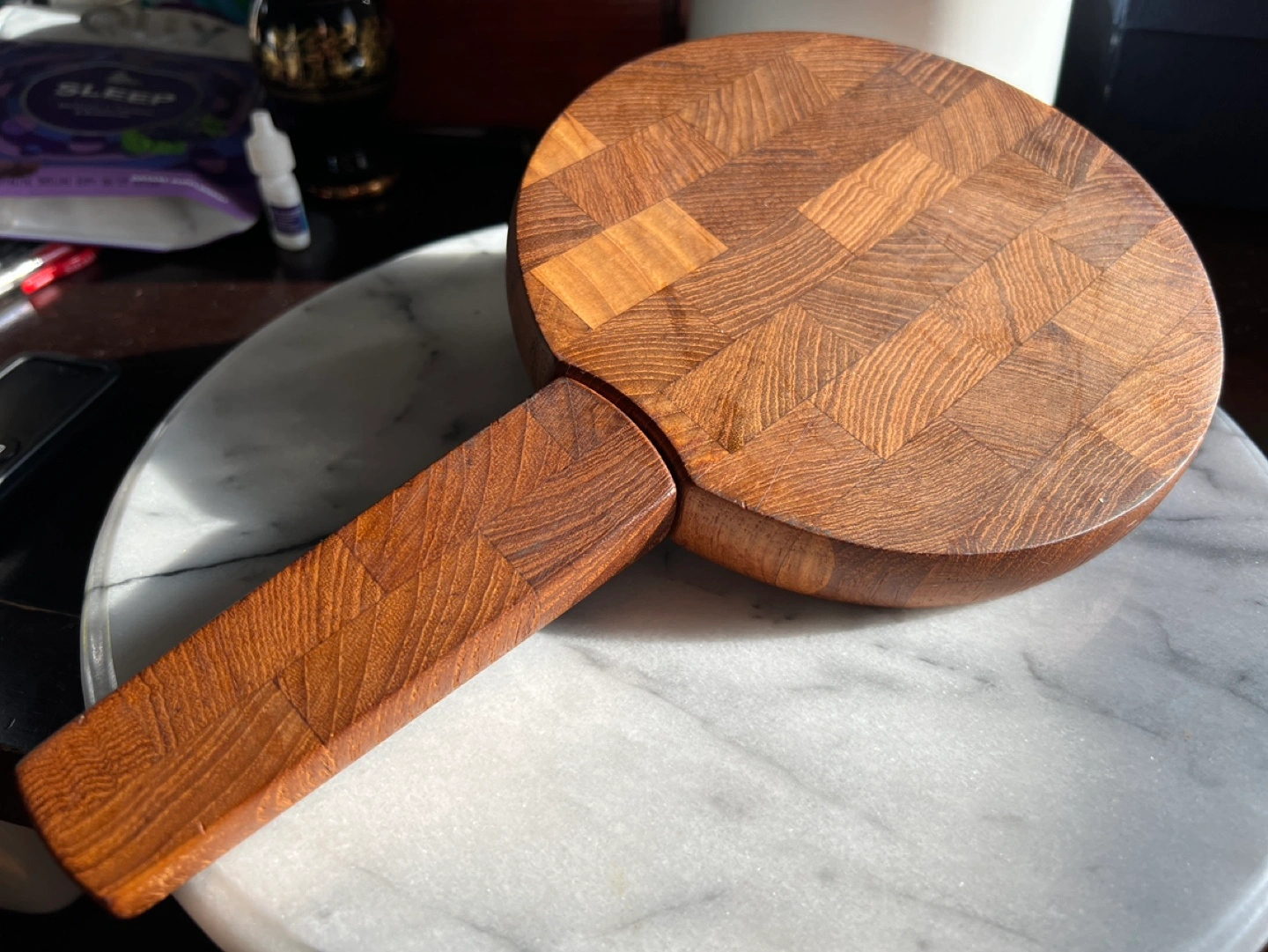 Cutting board is approximately 7” diameter.