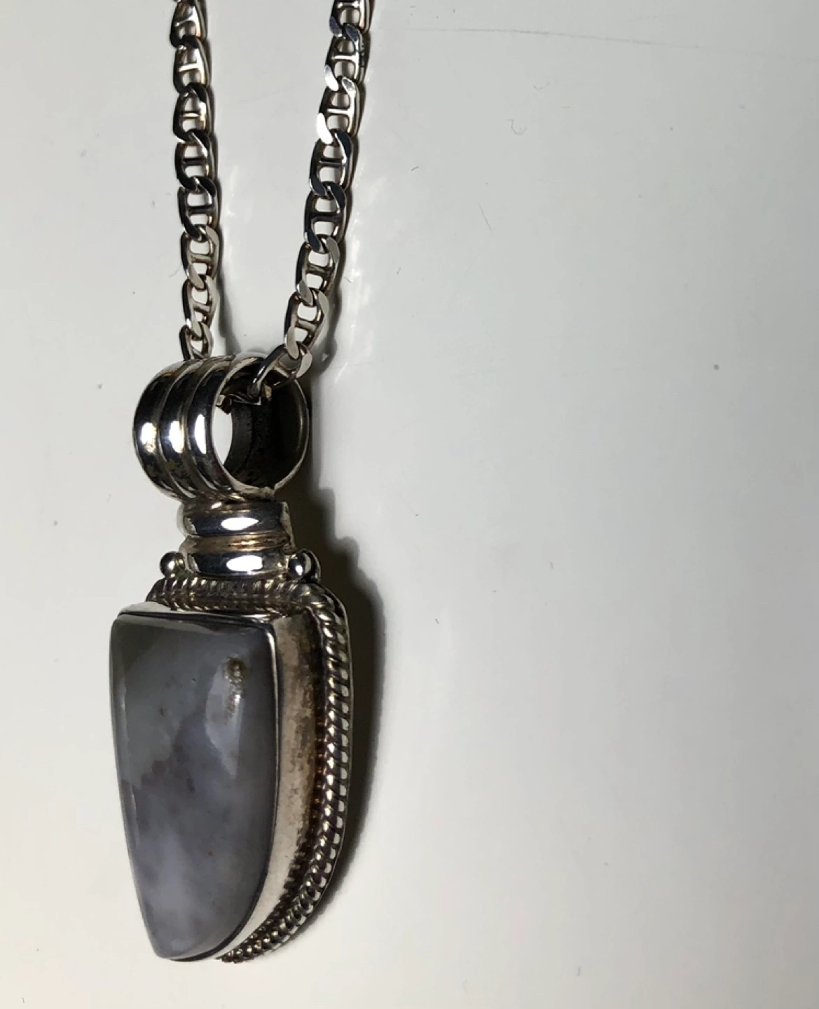 Silver necklace with an opal pendant set in silver. Chain is approximately 18 inches long. Stamped 925 in the back.