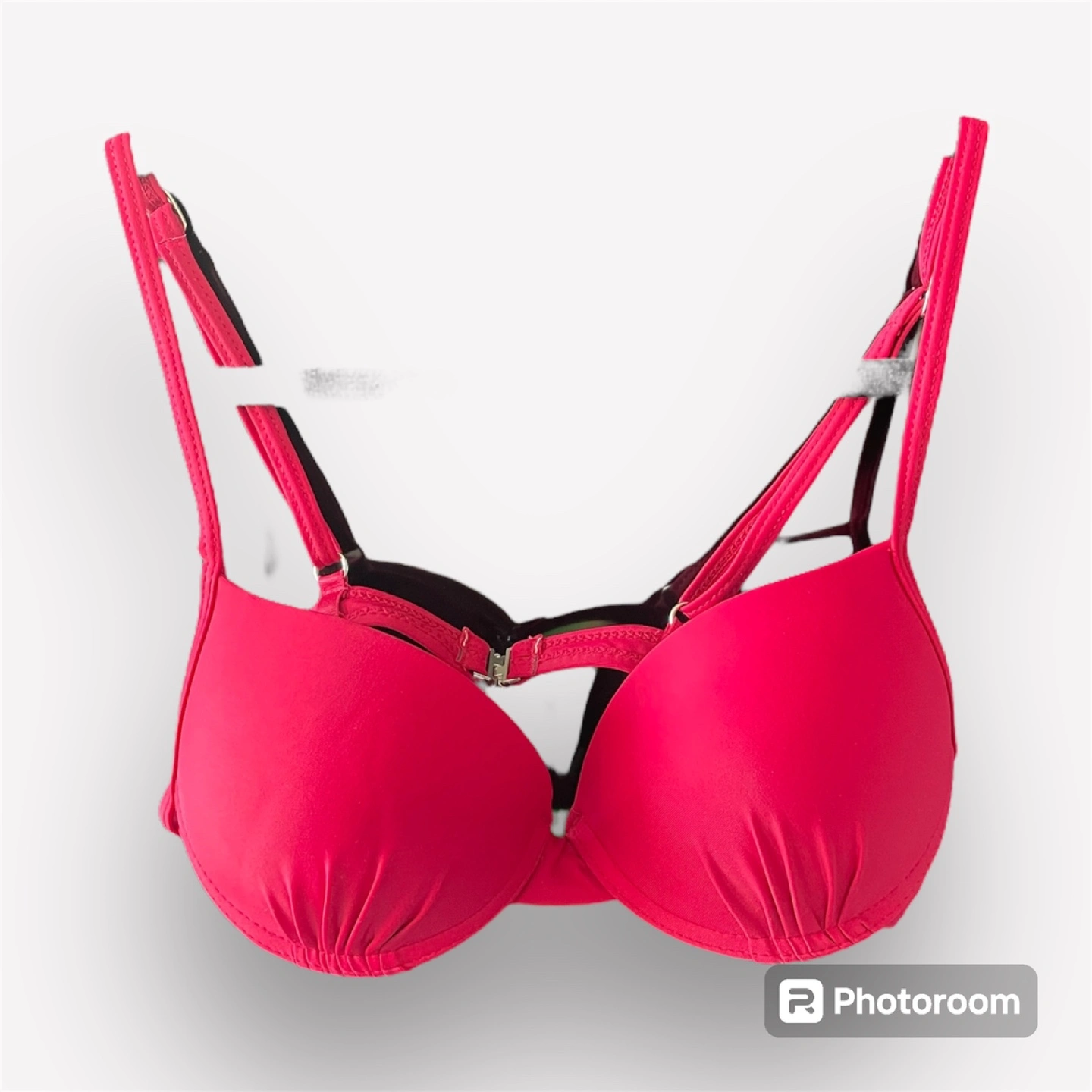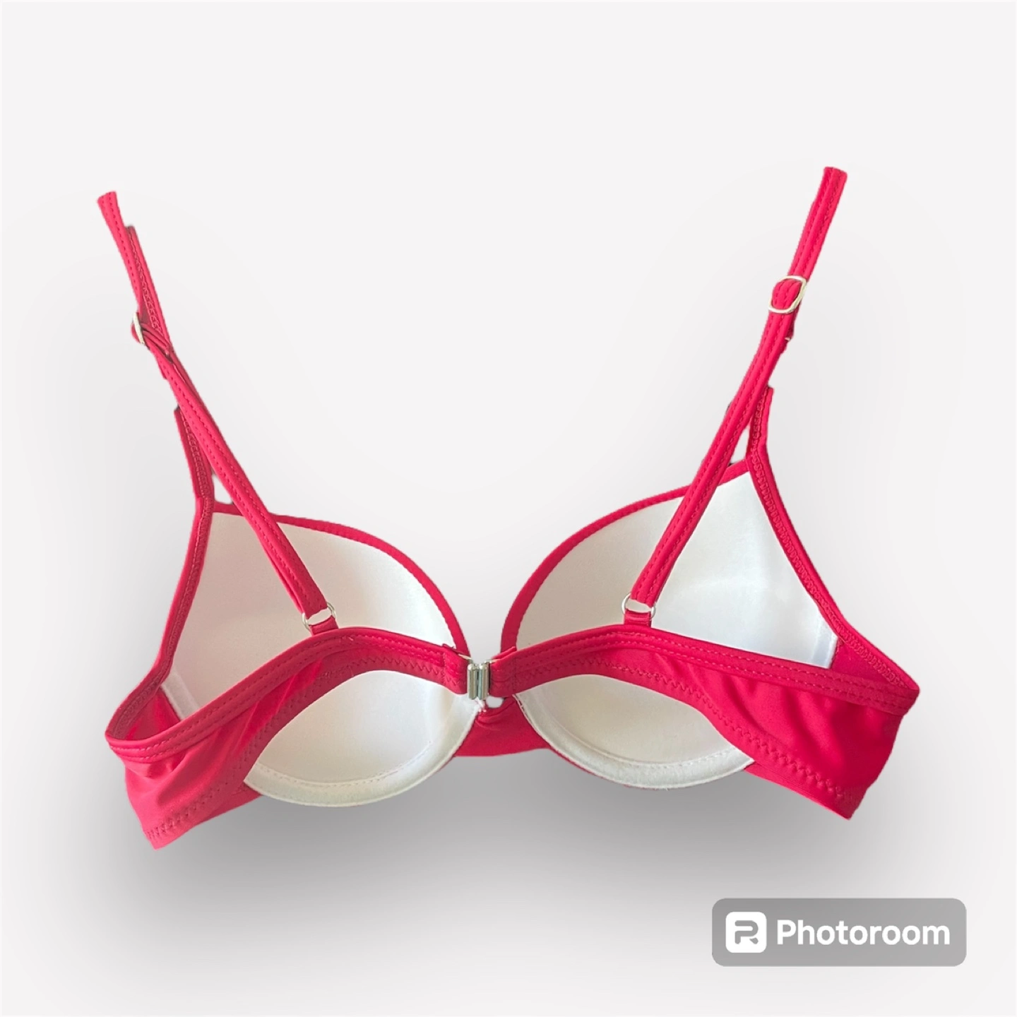 Red push up swimsuit. Underwire bra with adjustable straps. Two piece that looks like a one piece with a high cut leg.
