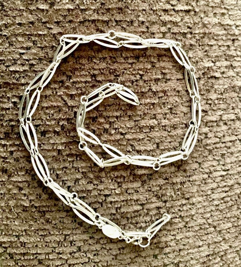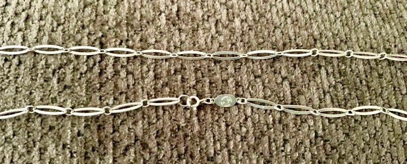 Never worn. 15.75” in length. Sterling silver, elongated circle link style necklace. My Mom purchased this in Mexico in the 50’s. Nice piece to wear alone or layered with other necklaces. Spring ring clasp. No box.