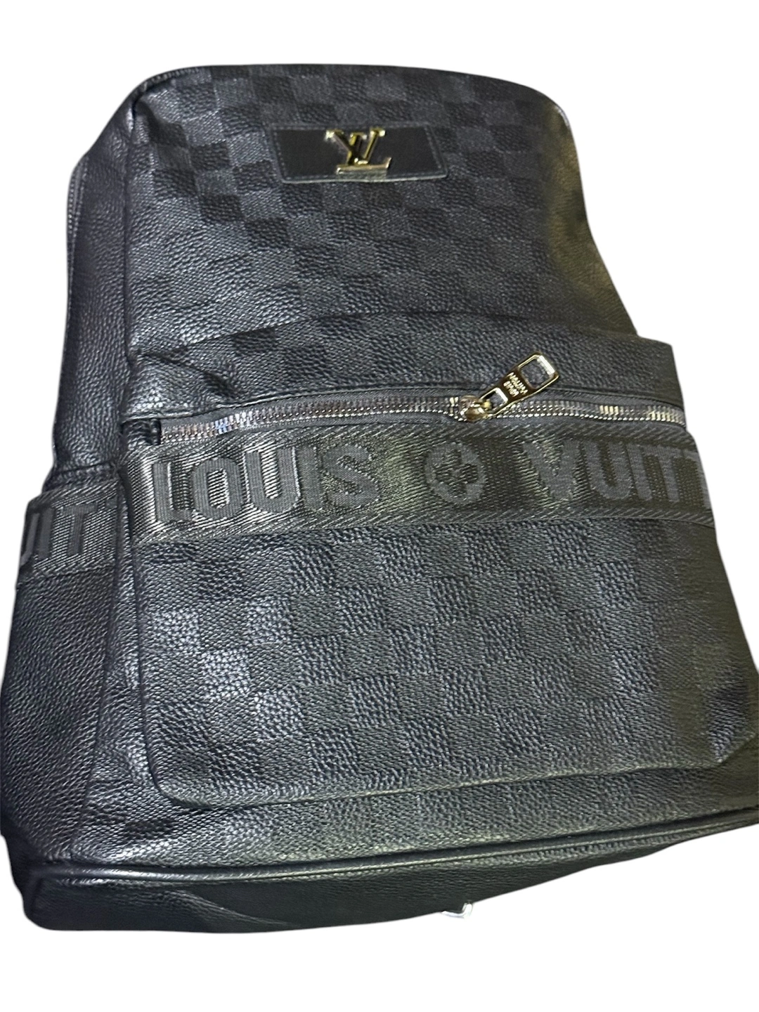 Black backpack with a checkered pattern. Features a top zipper and multiple pockets, including a zippered pocket on the front and a zippered pocket on the back. Comes with a silver zipper pull and a gold accent on the top flap.