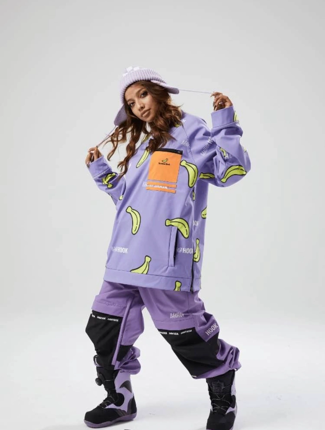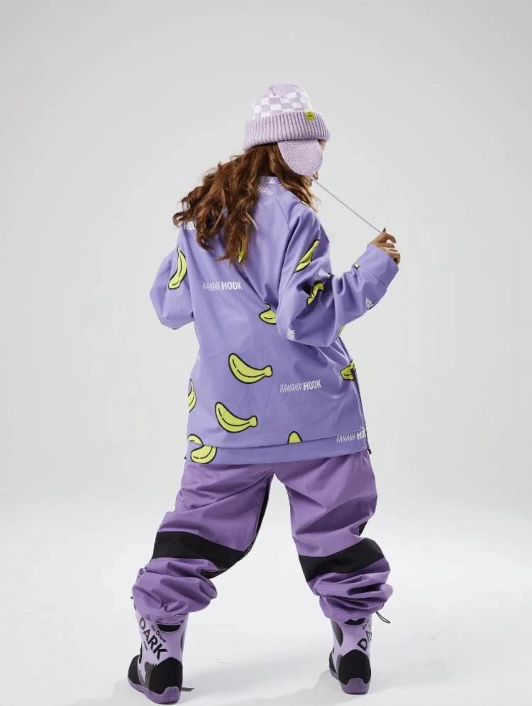Purple ski jacket with banana print. Features side zipper, elastic cuffs, and multiple pockets.