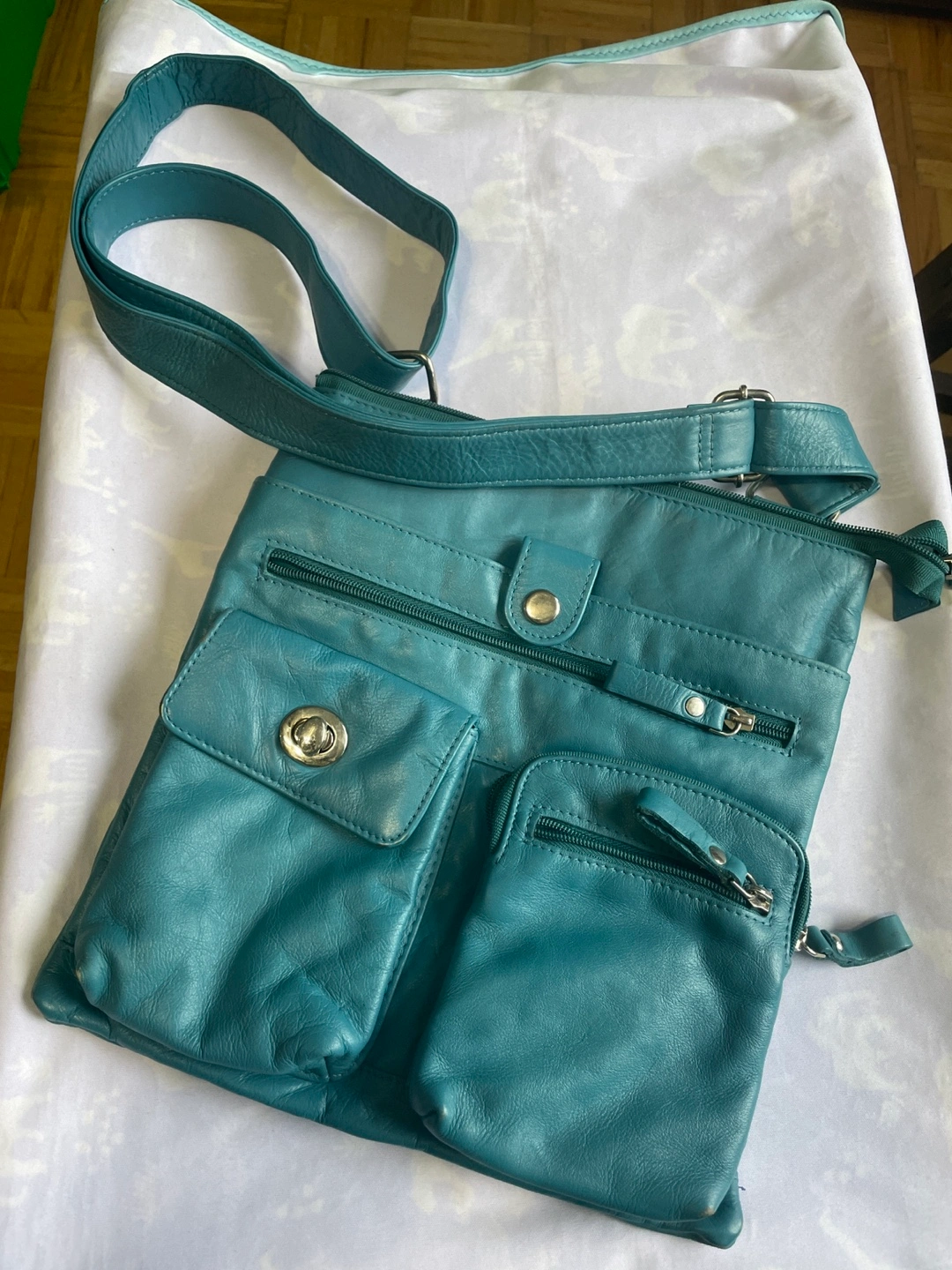 513Teal leather crossbody bag with multiple pockets. Adjustable strap. No pets no smoking