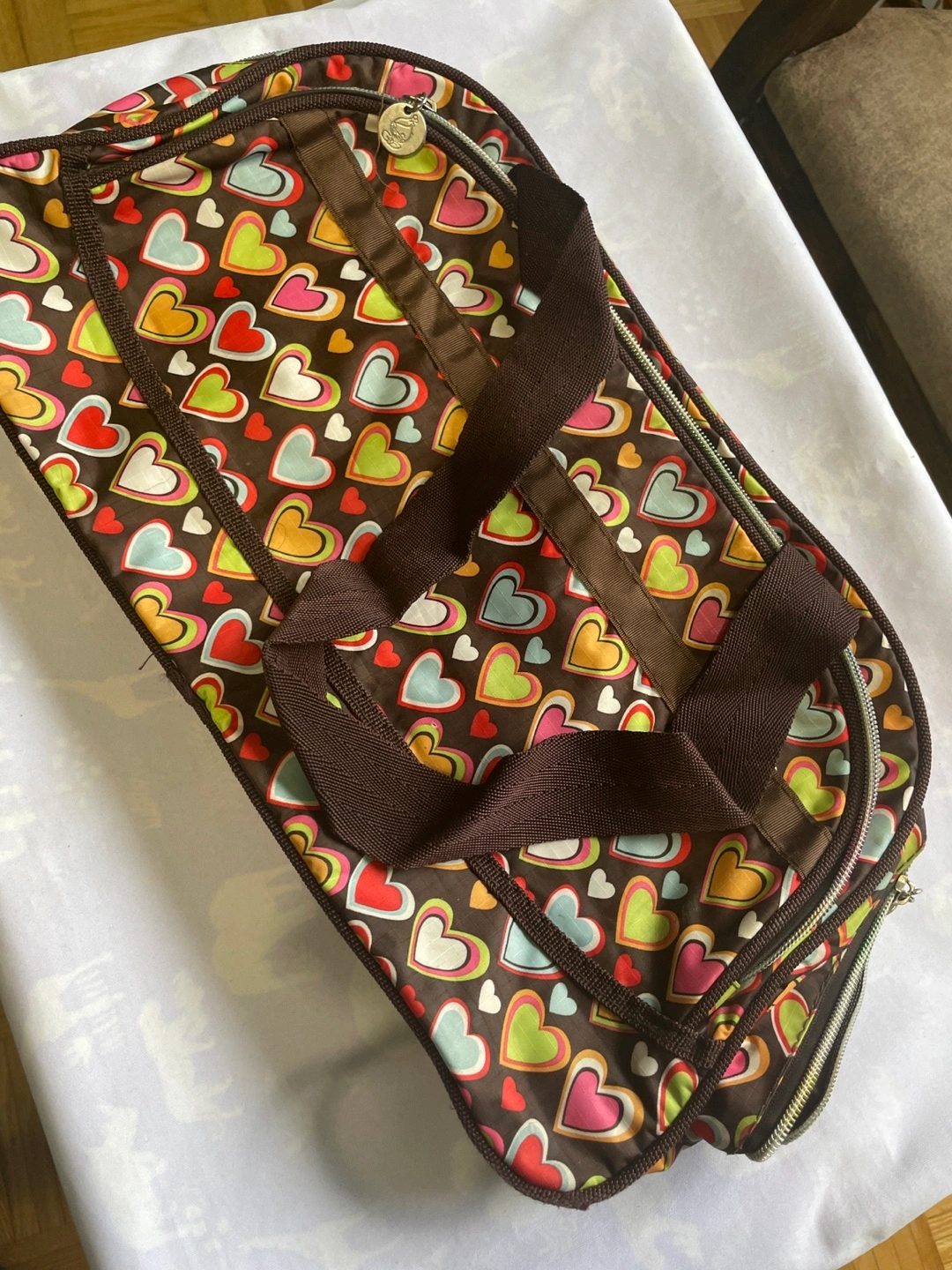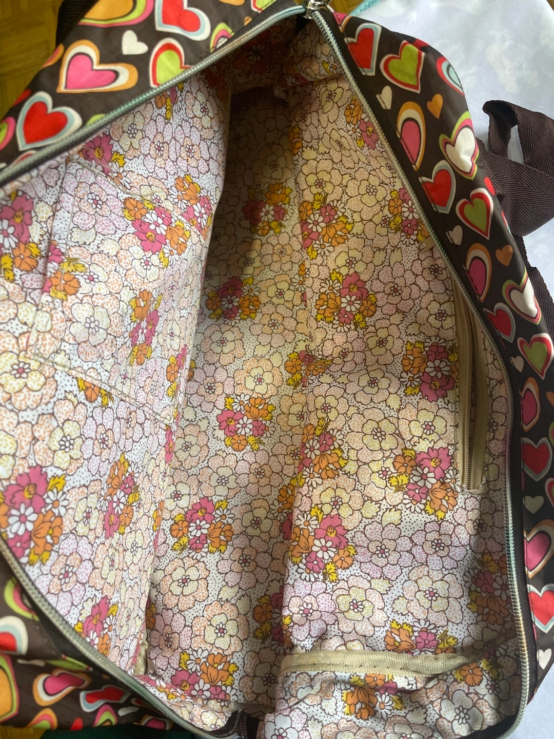 513Brown travel bag with multi-coloured heart print. Two top handles. Zipper closure. Floral print lining. Medium size No pets no smoking