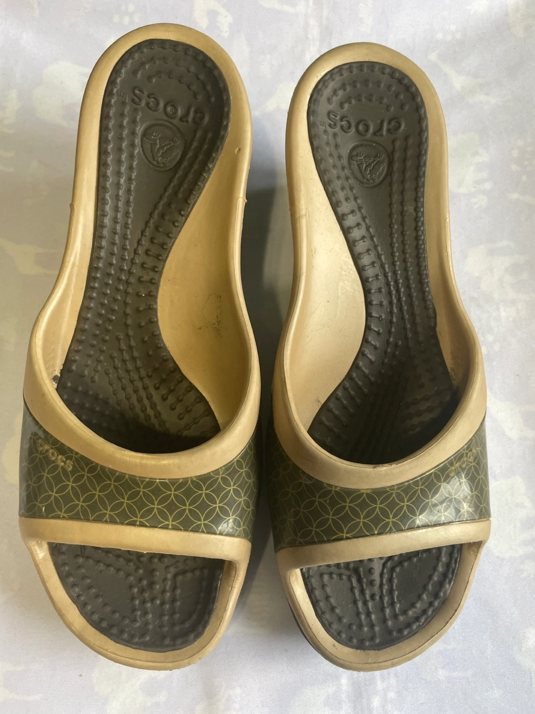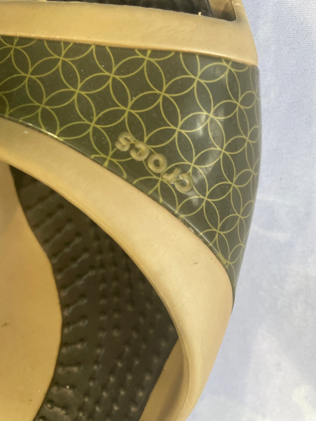 Women's Crocs wedge sandals. Green and tan colour with a geometric pattern.