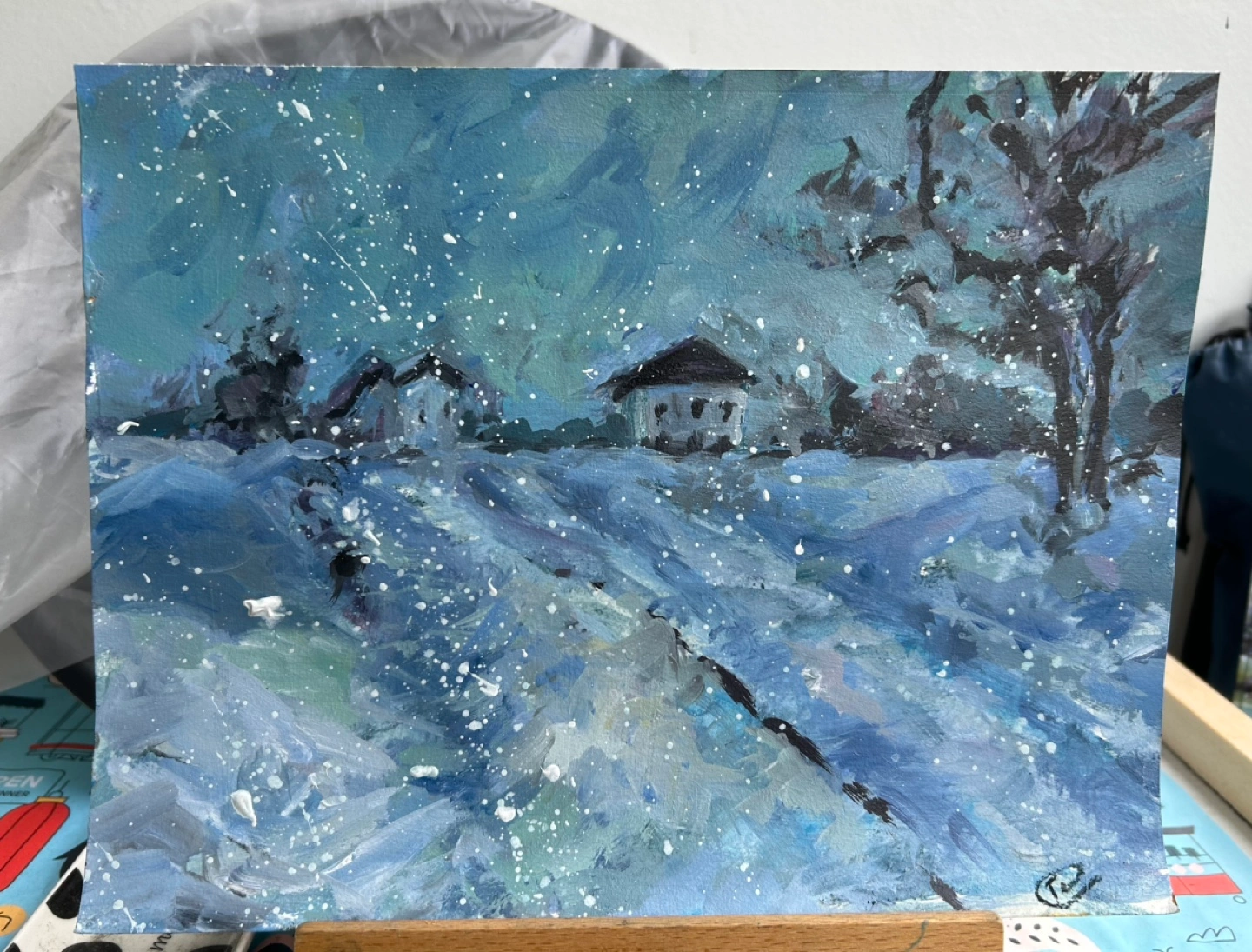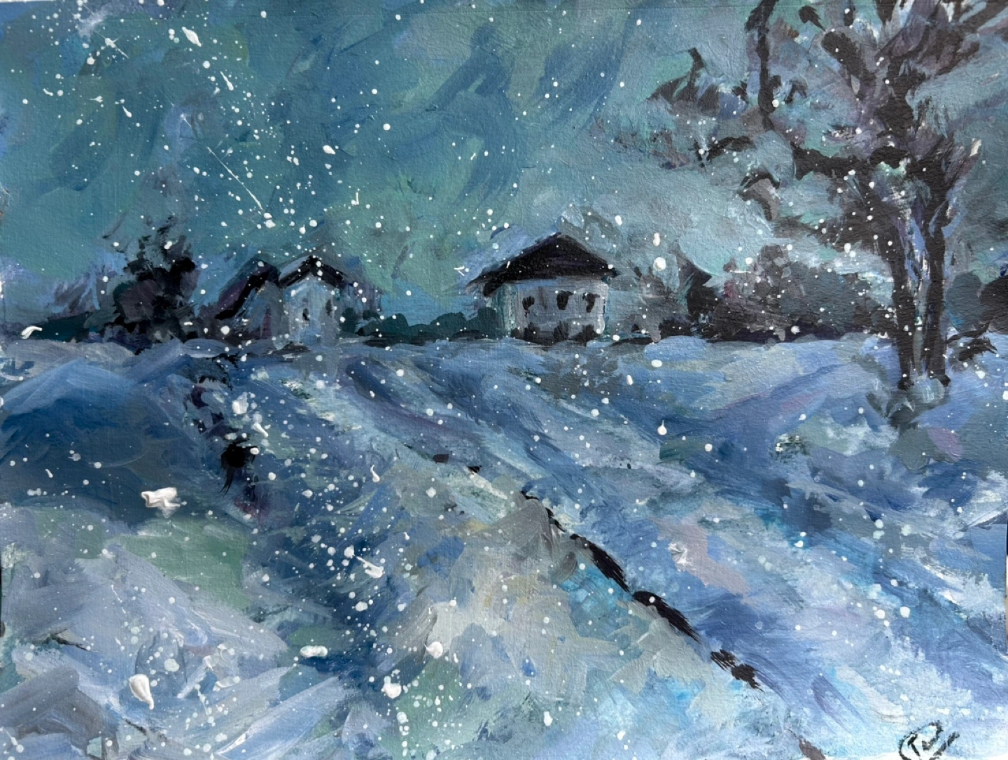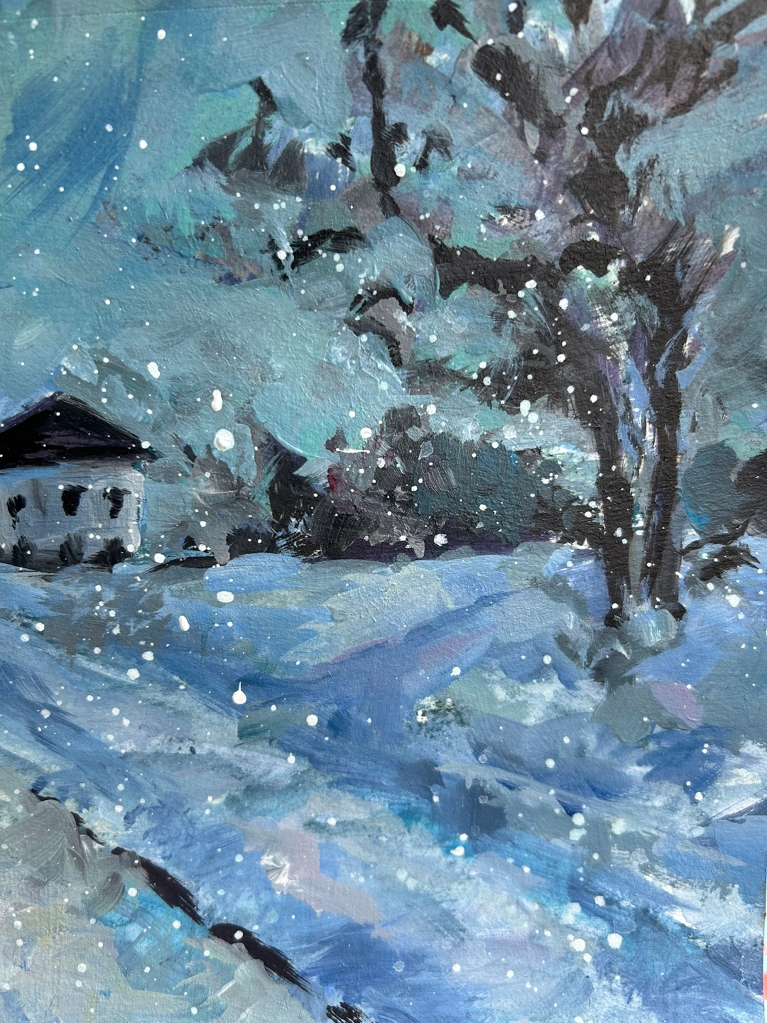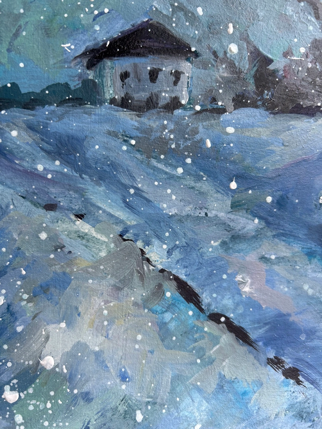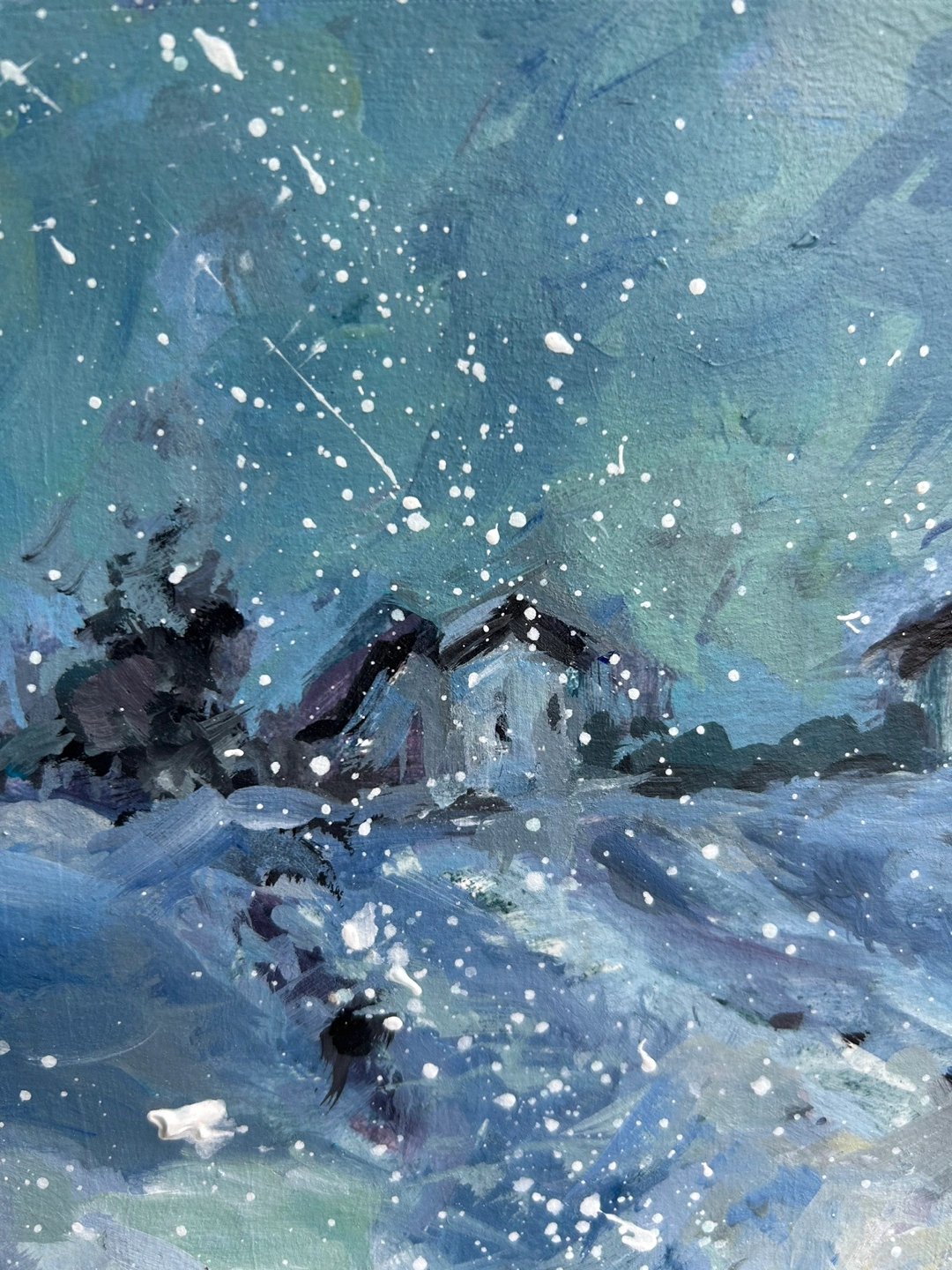“Snowstorm” 12x9 inches Acrylic on mixed media paper This is an original acrylic painting. It will be shipped/handed over to you unframed, protected with glassine paper in between two foamcore boards. Frame is not included, but I will supply framing suggestions if needed. Usually, matte is recommended for hiding the edges on this painting. Pickup in Surrey near King George or message me for shipping rates via Canada Post ——— Purchasing this piece helps support my journey as an artist, allowing me to continue creating more inspired work.