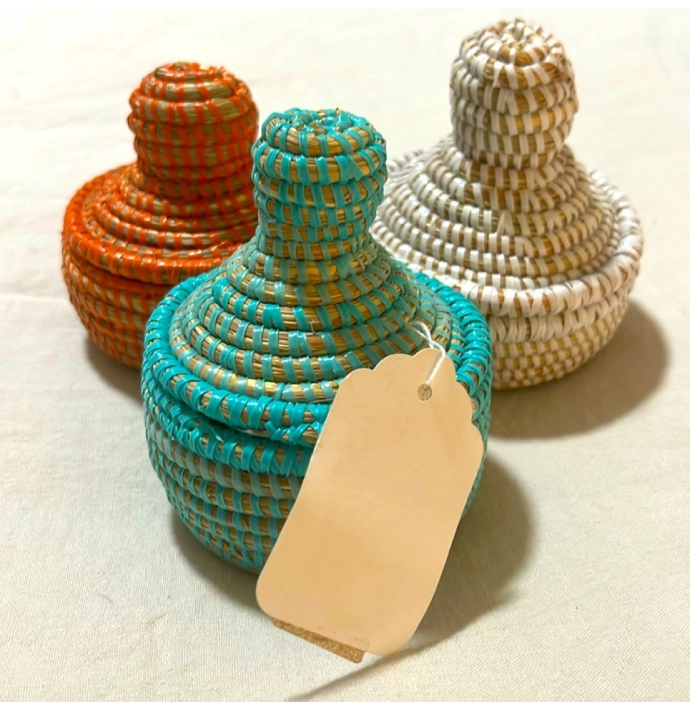 Handmade Artisan Senegalese Storage Baskets by 92villages 3.5” diameter each - Set of 3 Women Empowerment Project Each basket has a lid. One basket is orange, one is white, and one is blue.