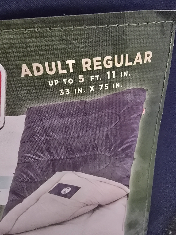 Adult regular sleeping bag. 20 degrees to 40 degrees comfort range. Features no-snag patented zipper, roll control, and no-tie patented closure.