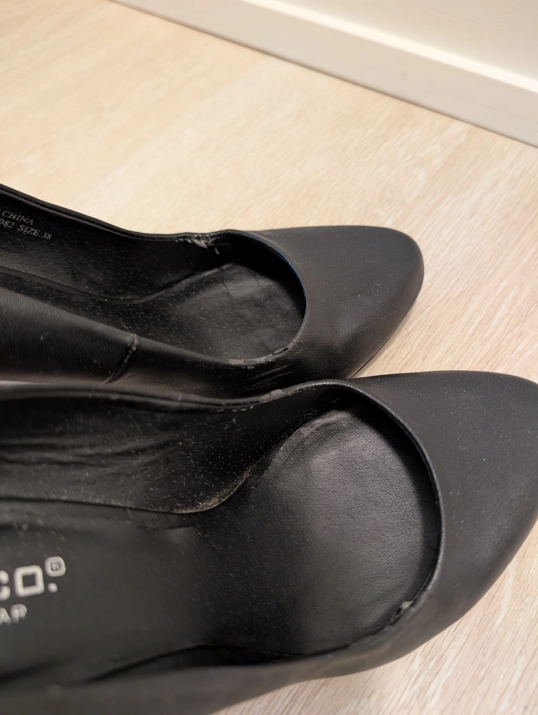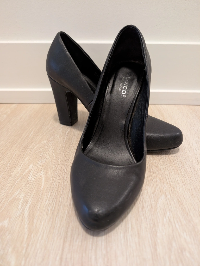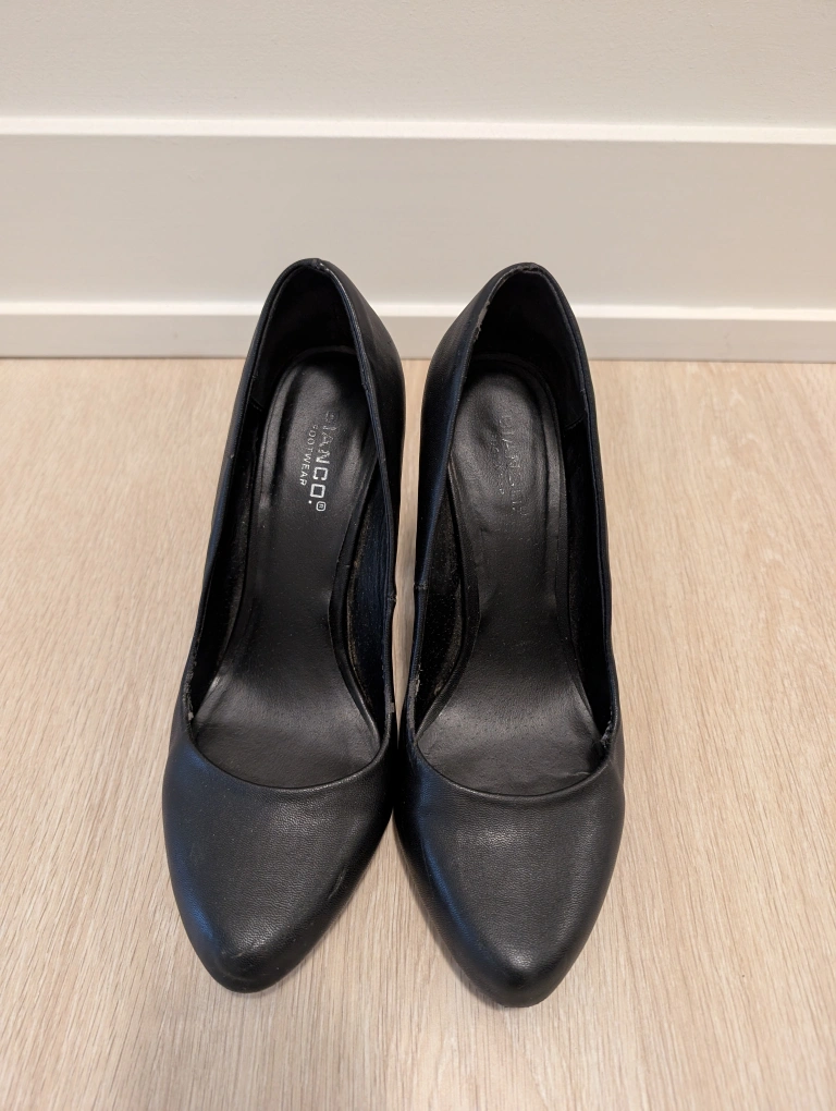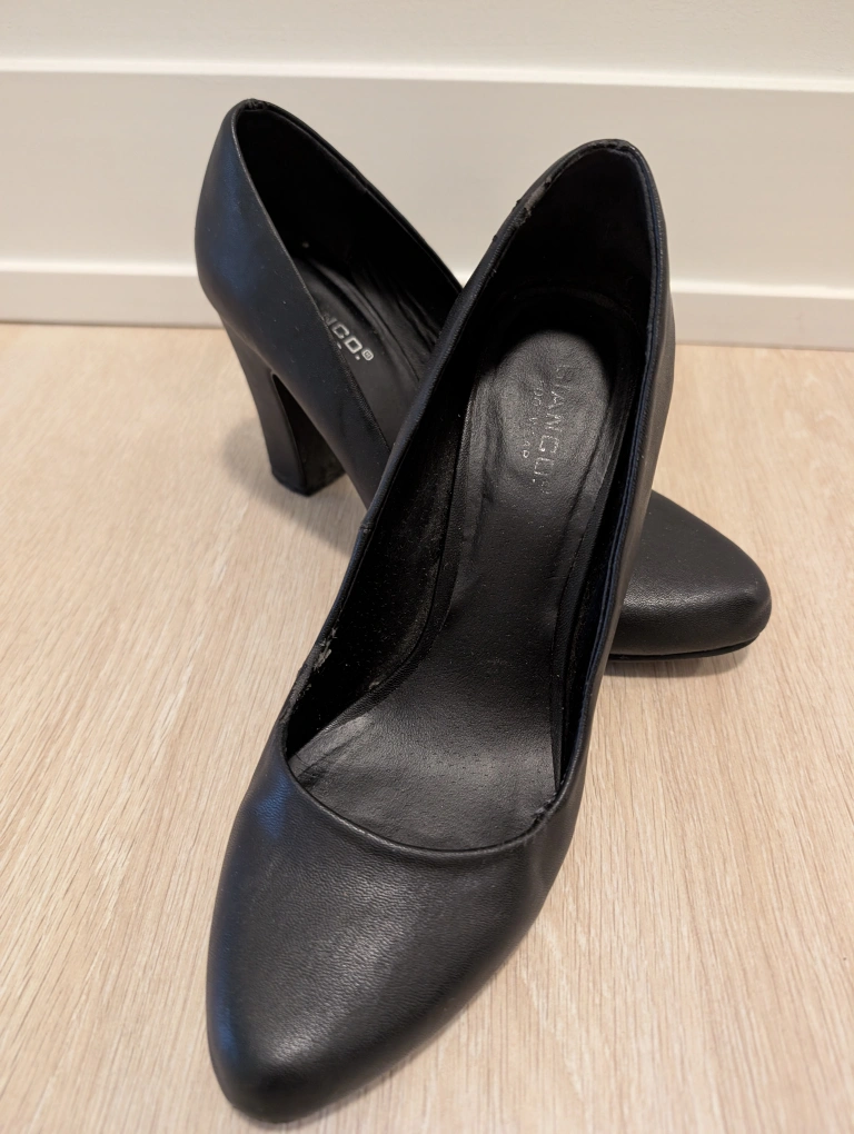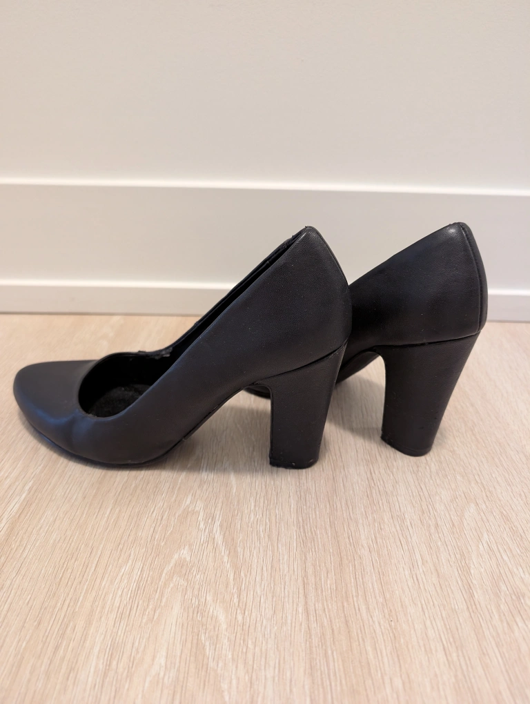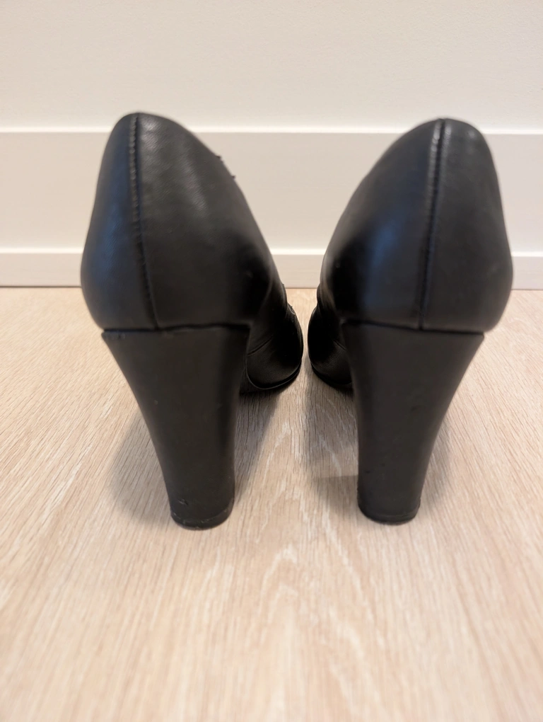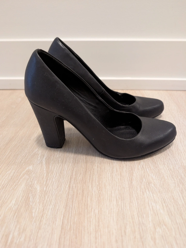Elegant black leather pumps with a block heel, European quality brand, size 38. Very comfortable and versatile. Some wear on the edges.