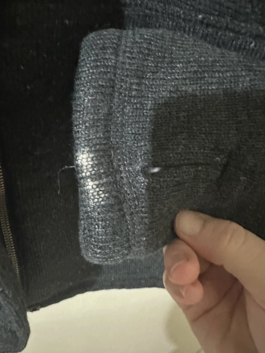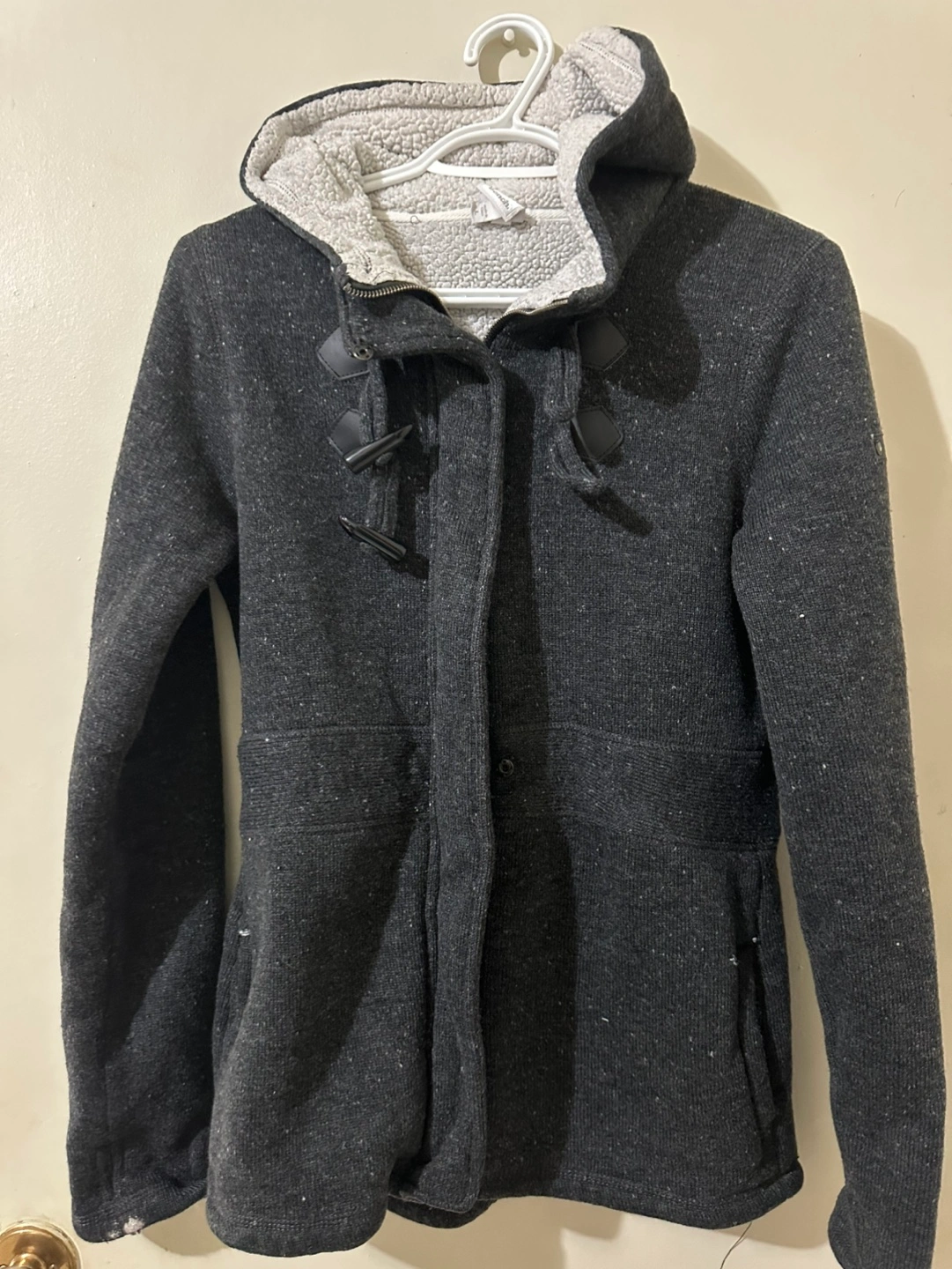 Grey and black hooded fleece jacket. Features two front pockets, a zipper closure, and a button-and-toggle closure at the top. Shows signs of wear on both sleeves but does not affect. Also slight wear on the one pocket.