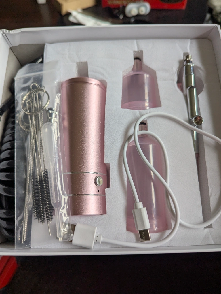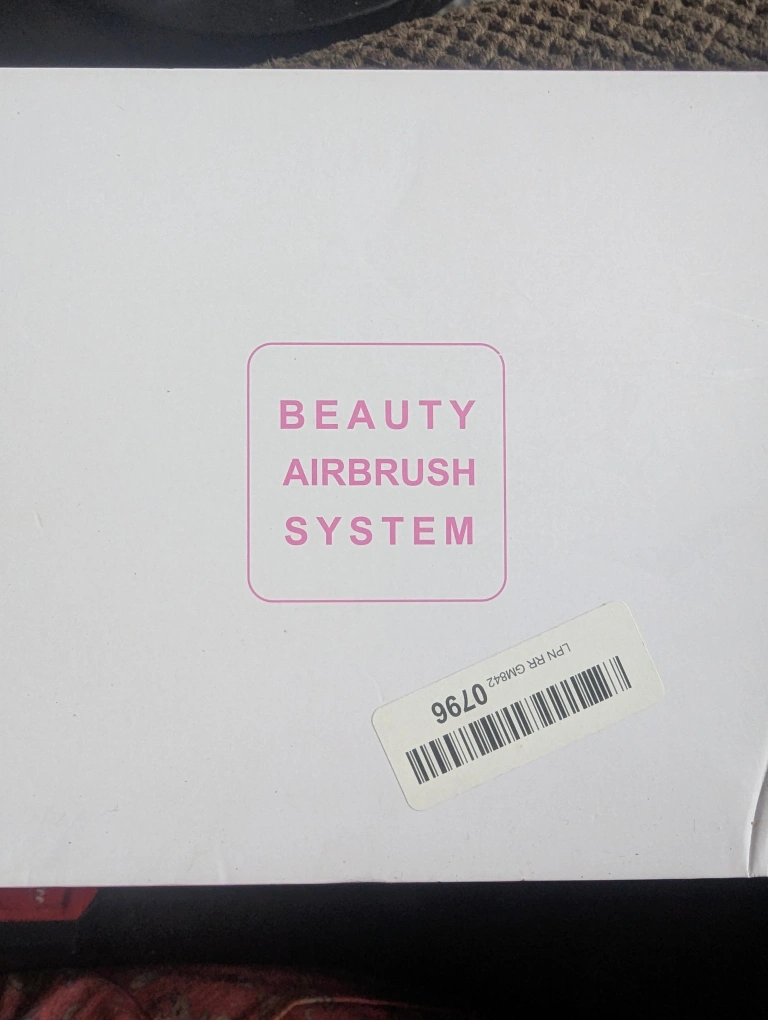 Airbrush kit, includes airbrush, compressor, and various cleaning tools. Comes with a charging cable. Pink and silver in colour.