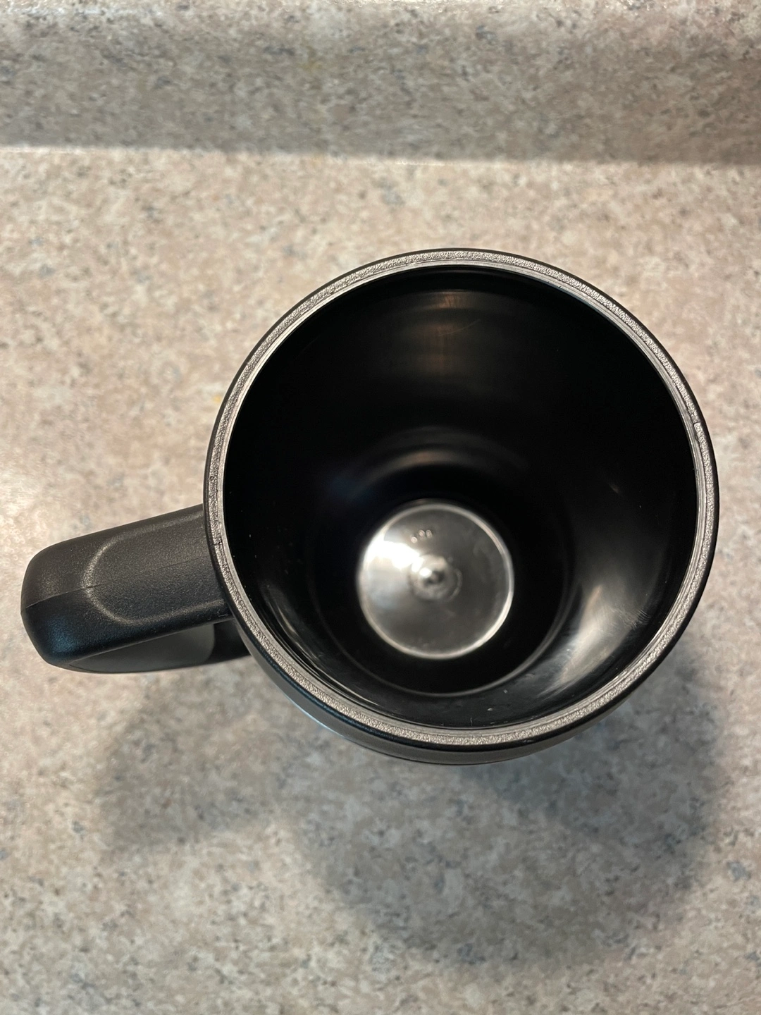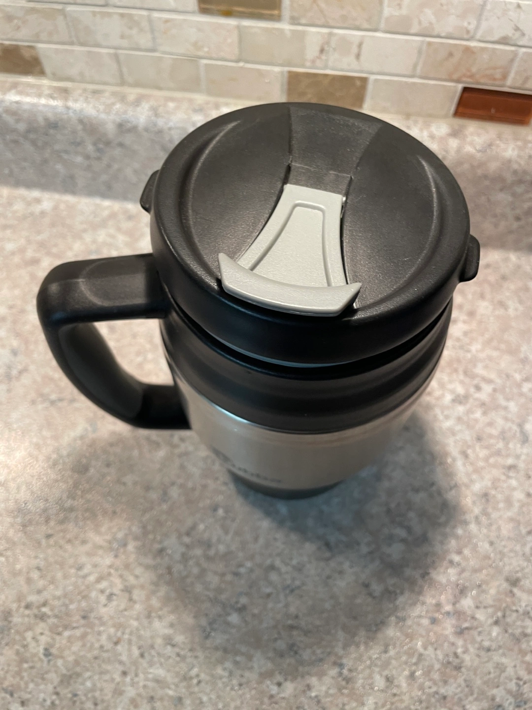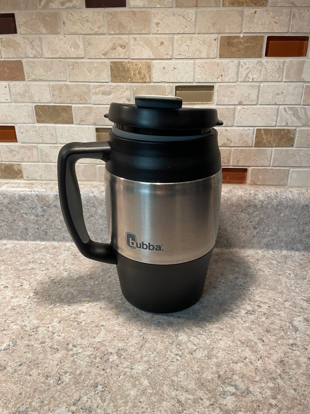 Stainless steel travel mug with black handle and lid. Keeps drinks hot or cold. No chips or cracks. Used only a couple of times, in new condition. 1L 34OZ.