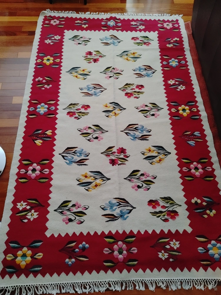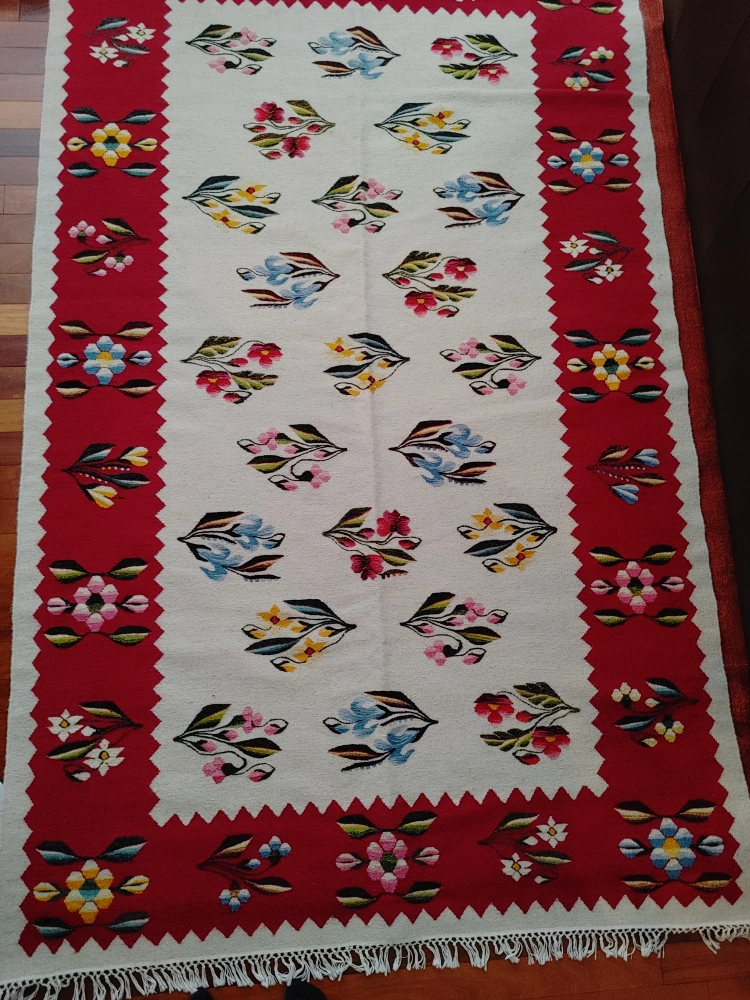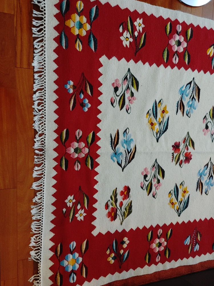 Beautiful hand-woven rug featuring a floral design in red and white. Has a fringed edge. wool. Piece of art, unique design made by a romanian artist: covor oltenesc. Can be hung on the wall or used as an area rug.