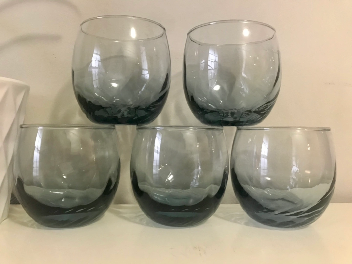 165Set of 5 grey roll poly glass tumblers. Round and slightly flared. All sales final. Curbside pick-up Woodbine and Gerrard