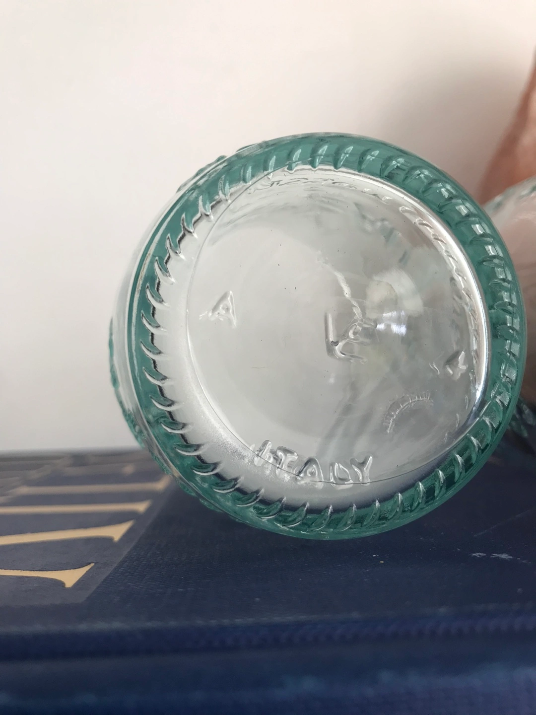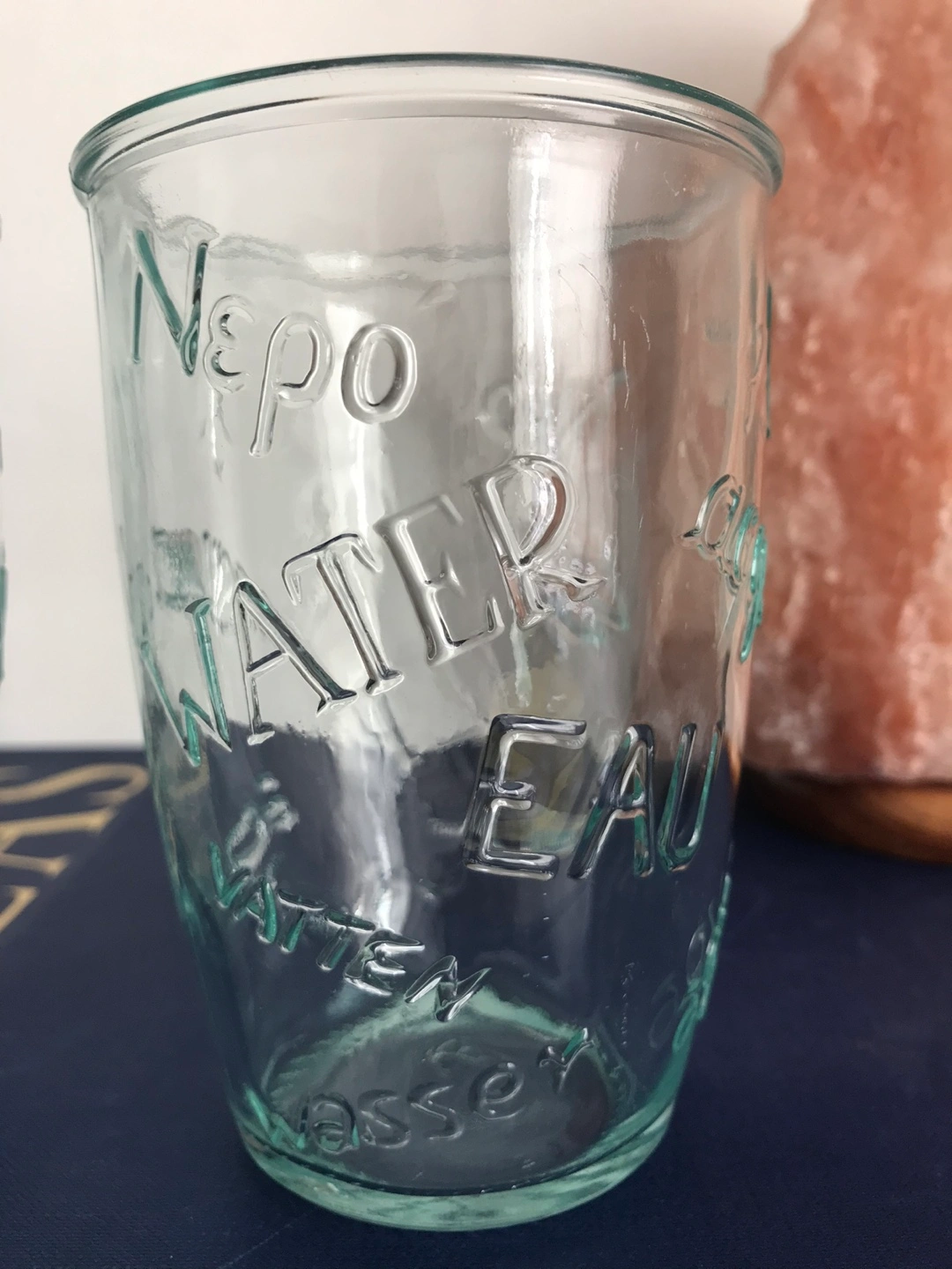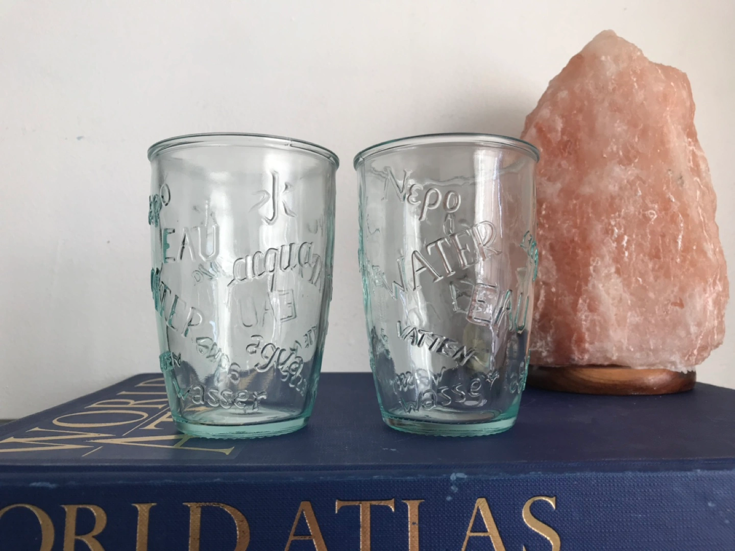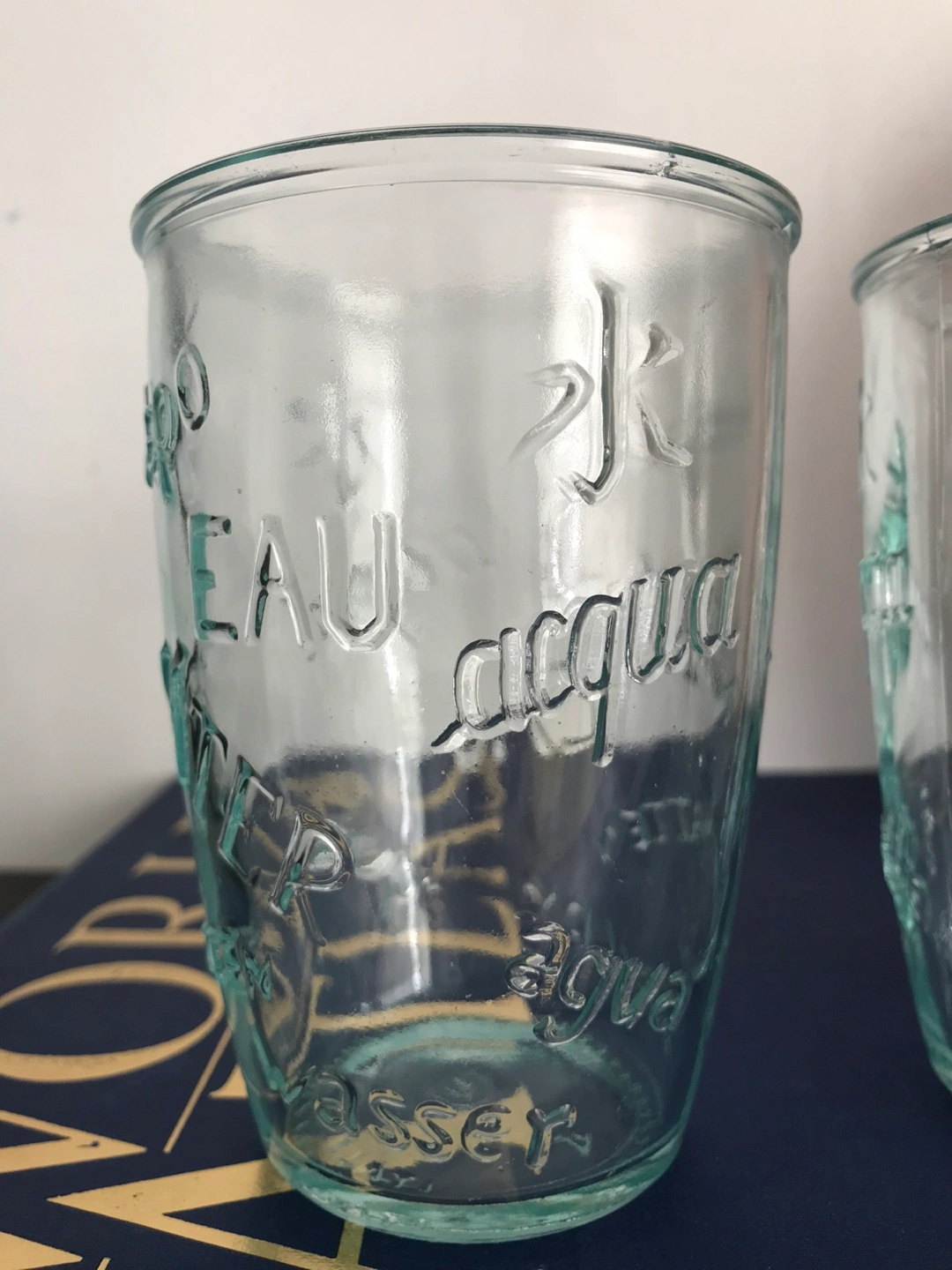 Set of 2 glass tumblers with embossed words 'Water', 'Eau', 'Acqua', 'Wasser' on the sides. Made in Italy.