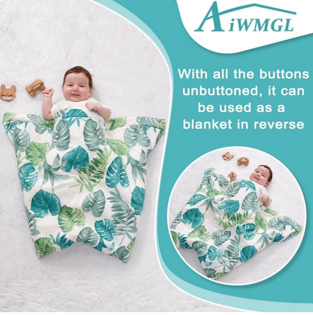 Multi-purpose baby essential. Can be used as a swaddle blanket, quilt, sleeping sack, stroller wrap or crib wrap. Made from soft, warm fleece cotton with a breathable cotton outer fabric. Three button closure for easy access. Features a tropical leaf design.