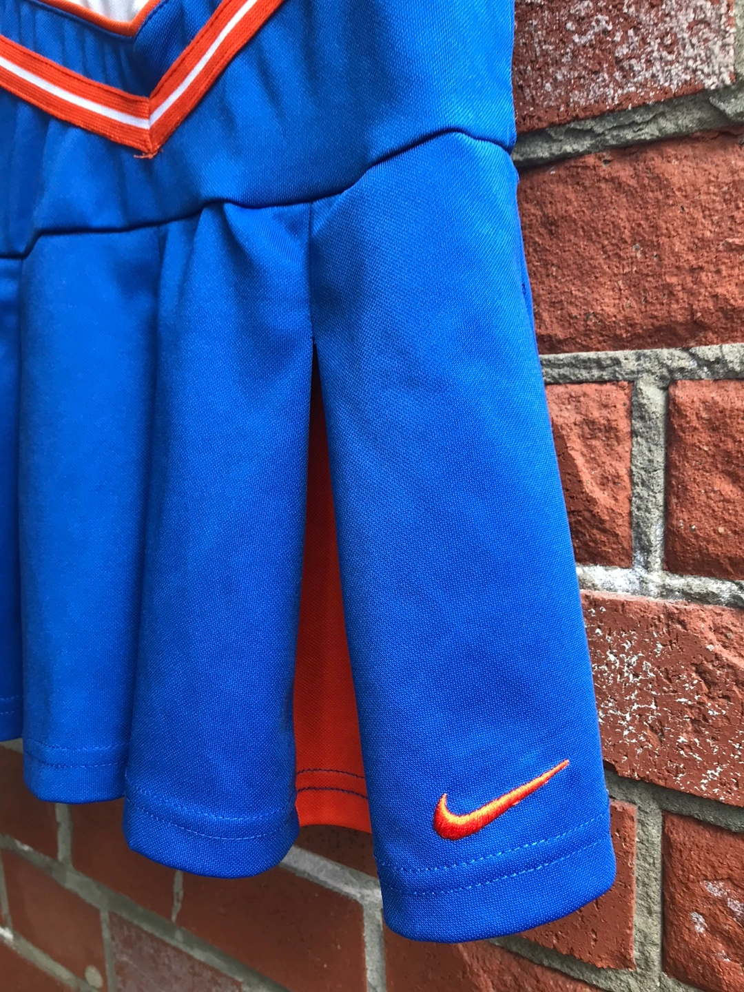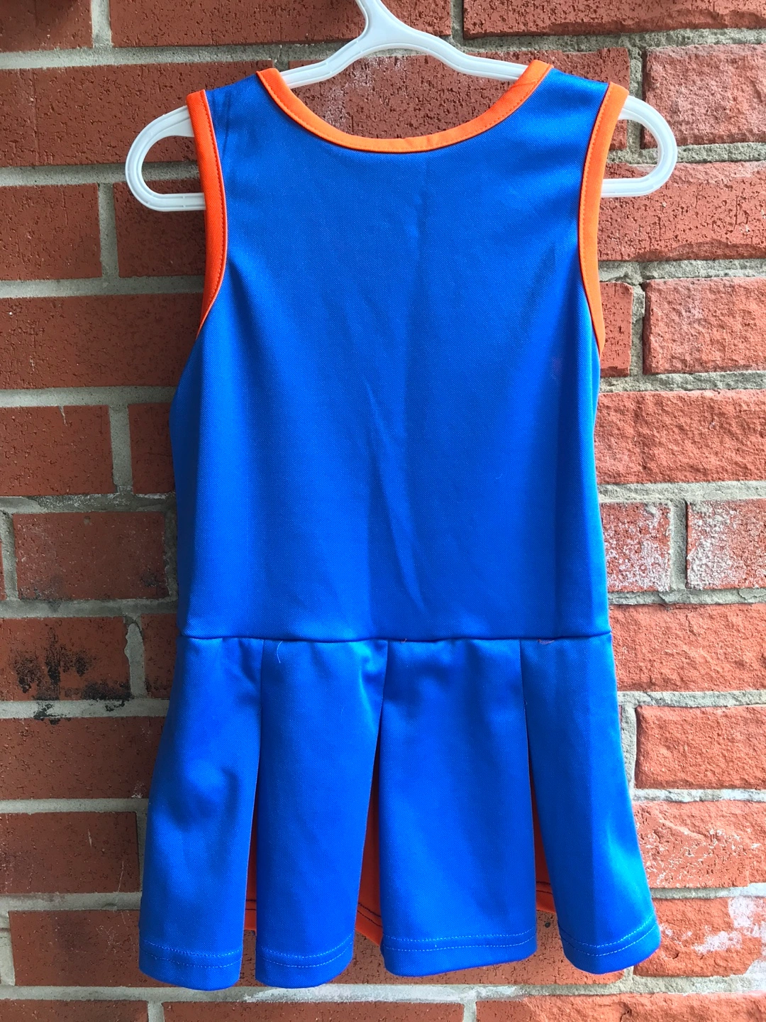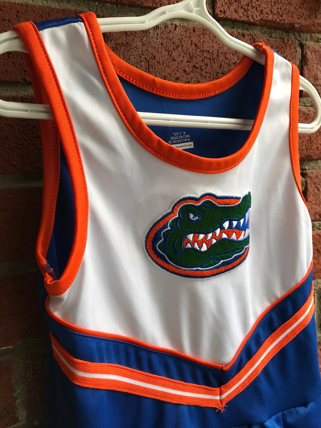 Cheerleader dress in blue, orange and white. Sleeveless, with a pleated skirt and a Gators logo.